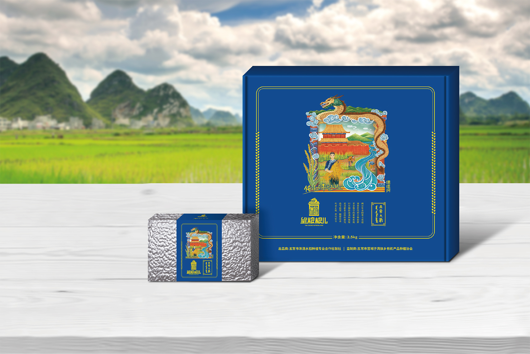 針對皇糧根兒大米中的高端產品——有機大米,繽策團隊在進行市場調研,查閱大量資料后發現電商市場中有機產品包裝多數以紅色與綠色為主,紅色對于中國民族具有獨有的心理印記,代表著吉祥喜慶,節日的歡樂,綠色則代表自然與生態,在視覺層面上大多數都趨于同化,無法留下獨特的品牌印象。在確定品牌文化后,在延續傳承滿族百年正統貢米的主題下,繽策團隊在如何表現滿族傳統方面進行了大量的資料收集整理與研究,發現代表滿族皇室的顏色正是有機大米品類中幾乎沒有的藍色,這種差異化的顏色本身就能夠起到超級符號的作用;在內容方面則選取了與品牌logo相同結構的龍與皇城組合而成的元素,一方面呼應logo,另一方面不斷加強皇糧根兒的品牌印象,形成聯動效應。