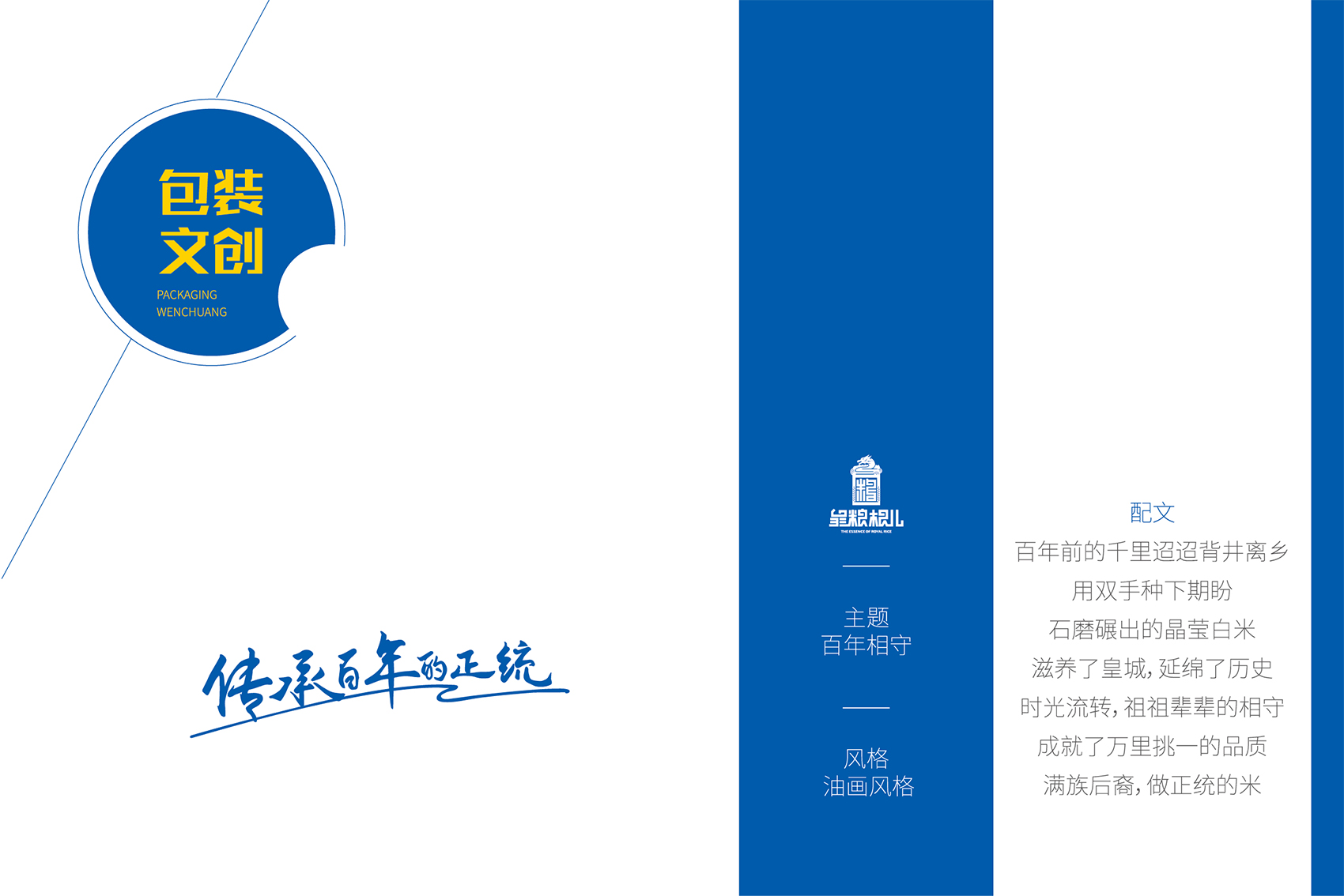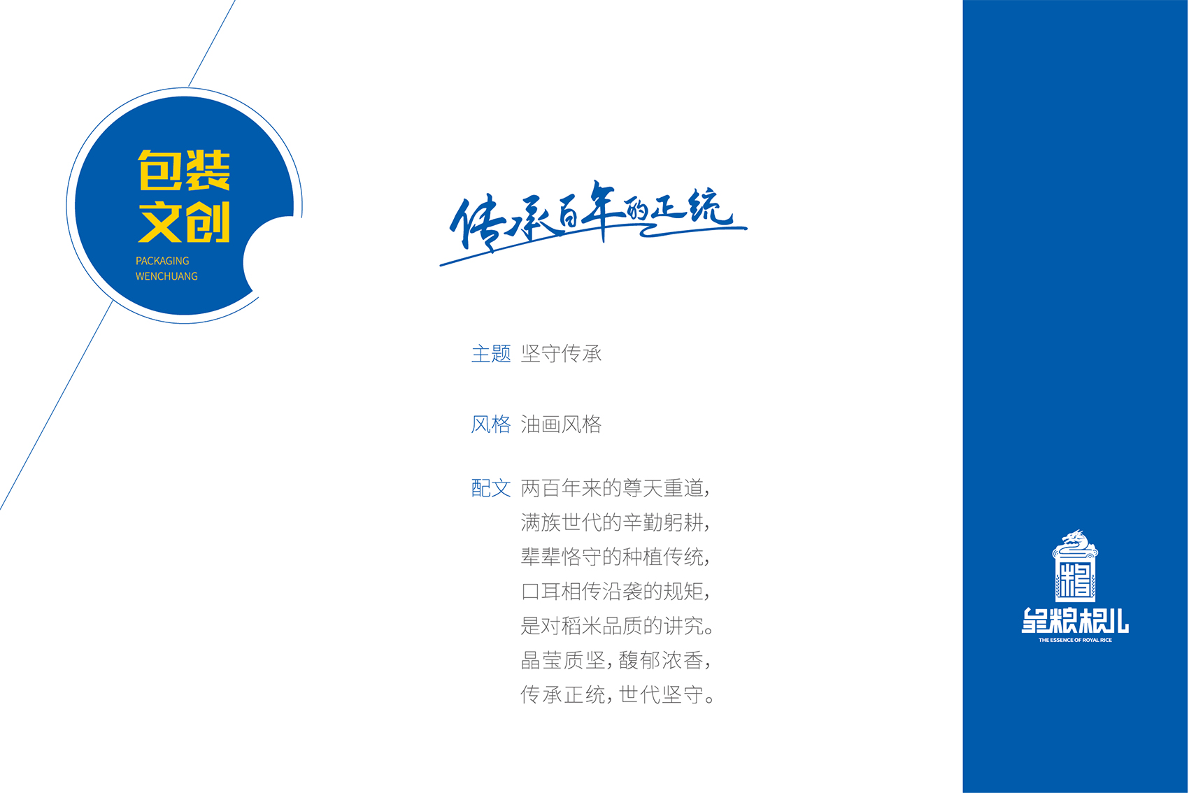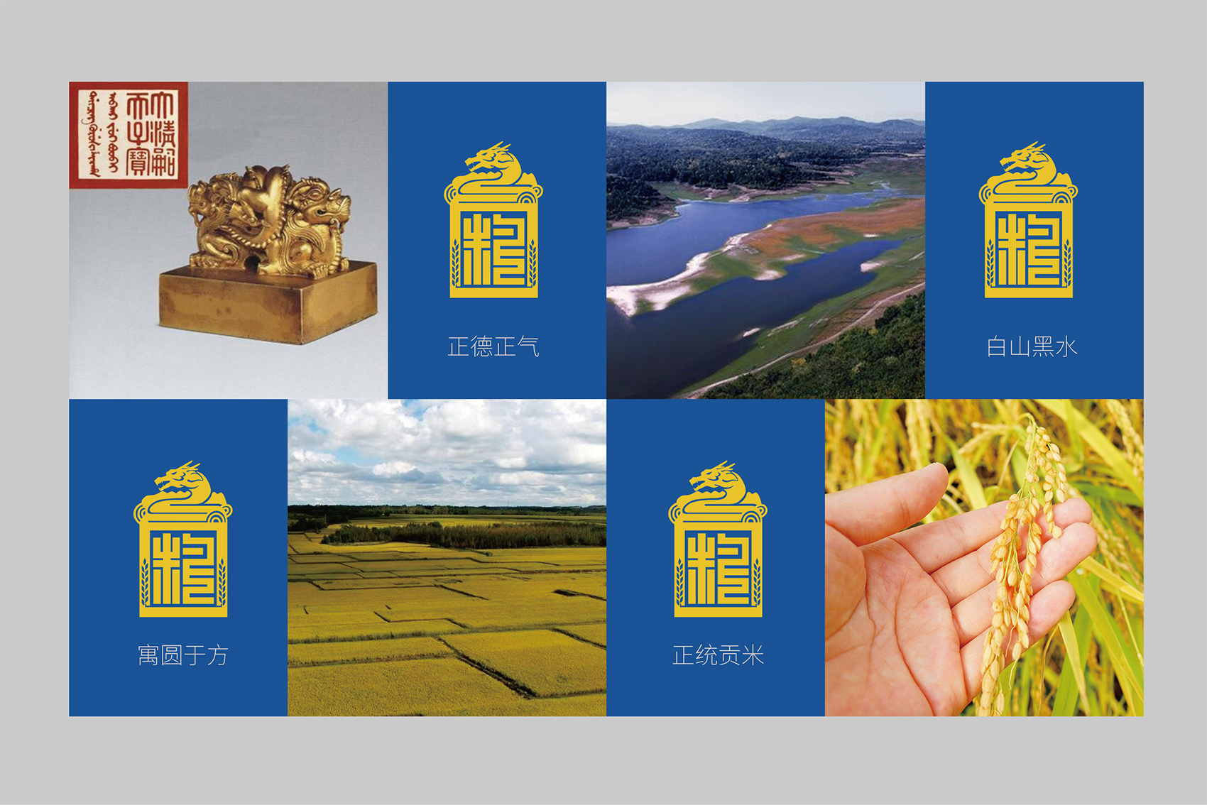 以兼顧理解與傳播度的slogan——傳承百年的正統成為了皇糧根兒不斷堅守與傳承的最好注解。皇糧根兒大米的logo采用了玉璽的形象來傳遞200年的皇室貢米內涵,其中的環繞其中的白山黑水象征著滿族的龍興之地,原創設計字體采用了乾隆年間玉璽篆字字體風格,將皇糧根三字都融為一體,整體可以視作“糧”字,配合兩旁的水稻紋樣點明了行業屬性,端莊大氣,頗具皇家風范,在具有設計感的同時,能夠將皇糧根=正統貢米的品牌印象植入消費者心智。