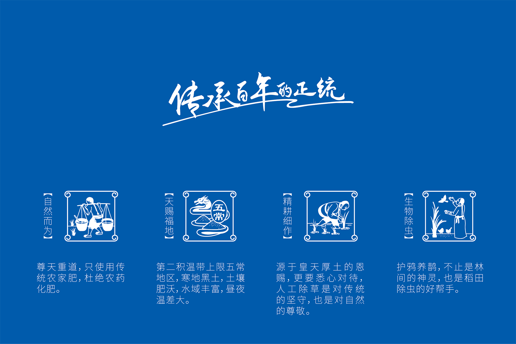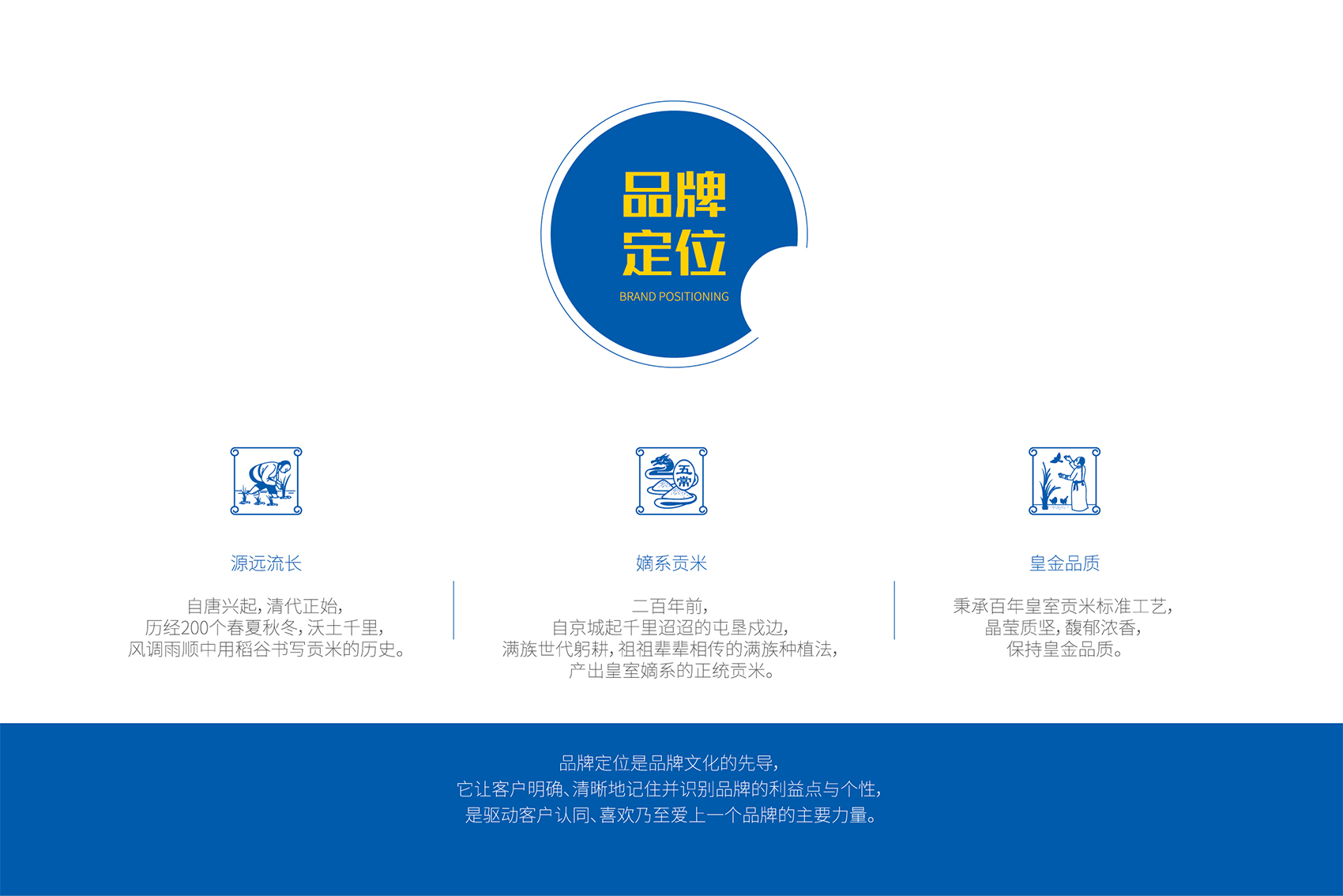 作為品牌的核心競爭力,品牌文化需要彰顯產品自身的特點和與眾不同的差異化存在,結合創始人的發心與愿景,創造出具有獨特價值的文化系統。繽策團隊在與企業座談中了解到五常市營城子滿族鄉自唐興起,清代正始,歷經200個春夏秋冬,世代種植貢米的悠久歷史,是品牌所具備的獨一無二的天然優勢,同時也是產品品質值得信賴的根源所在。這使得皇糧根兒有機大米采用滿族傳統種植方式,進行有機種植,杜絕農藥化肥,傳統的生物除蟲人工除草,精耕細作保證產品品質。這也成為了皇糧根兒品牌文化的出發點與落腳點。