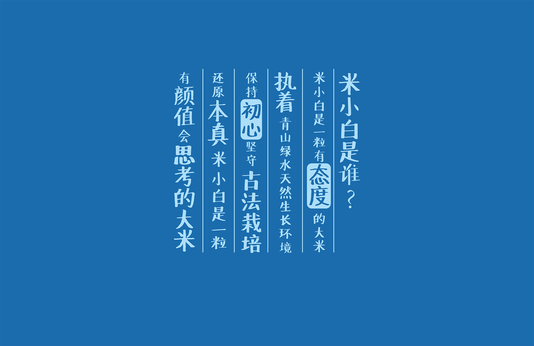 黑龍江米小白生態(tài)農(nóng)業(yè)發(fā)展有限公司,坐落于五常,以綠色生態(tài)農(nóng)業(yè)為目標(biāo),秉承尚智、誠信的原則,著力打造全新意識(shí)、更符合現(xiàn)代消費(fèi)者的時(shí)尚米業(yè),產(chǎn)品渠道覆蓋線上線下,地域輻射全國,旗下主營稻花香大米。企業(yè)主營渠道定位于線上,目標(biāo)消費(fèi)群體為20-40歲群體,希望通過包裝將產(chǎn)品古法種植、堅(jiān)守良心的品牌精神傳遞給廣大消費(fèi)者,同時(shí)以區(qū)隔于其他傳統(tǒng)五常大米,用年輕化趣味化的風(fēng)格助力更多年輕消費(fèi)群體了解接受品牌。