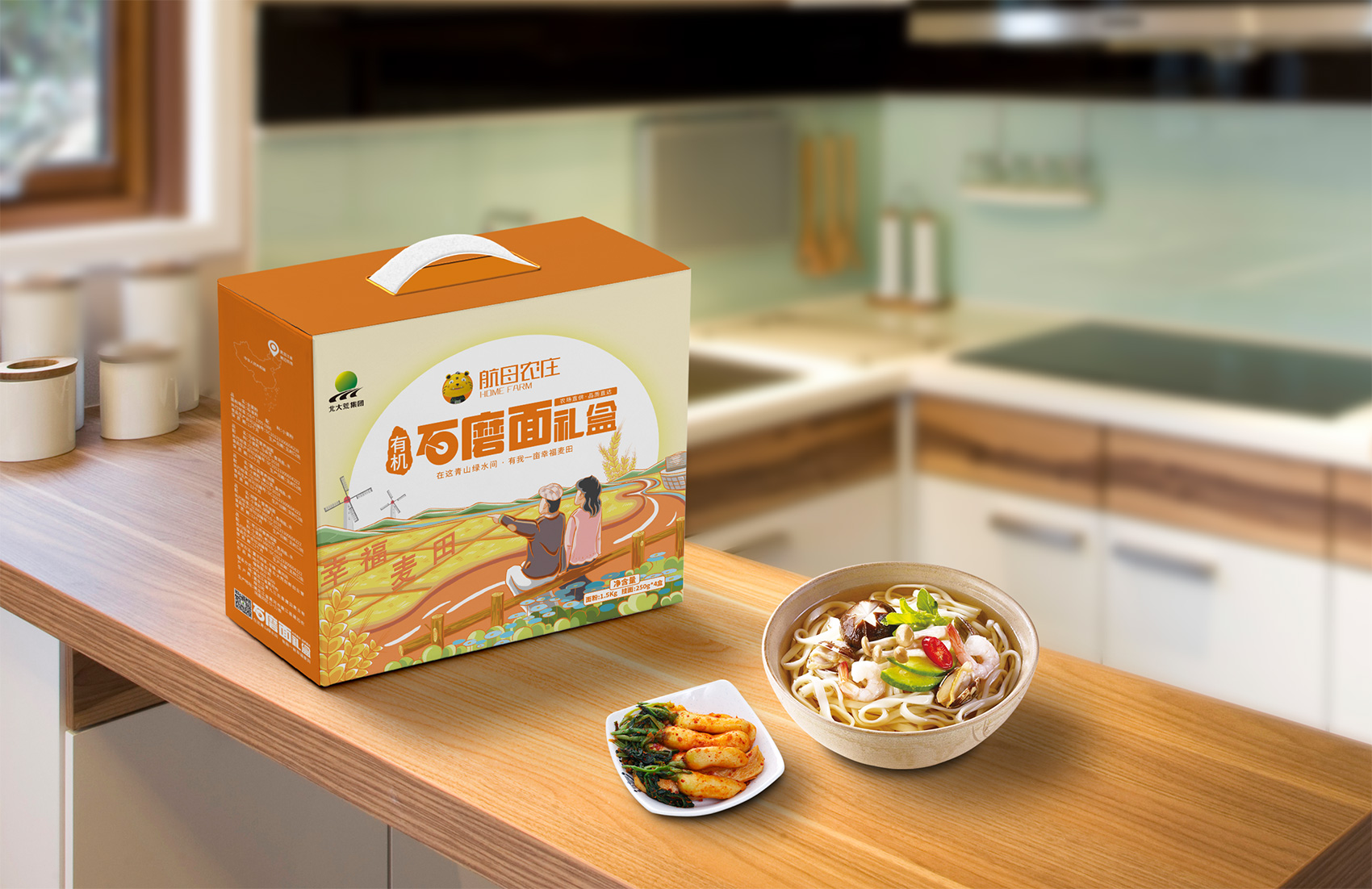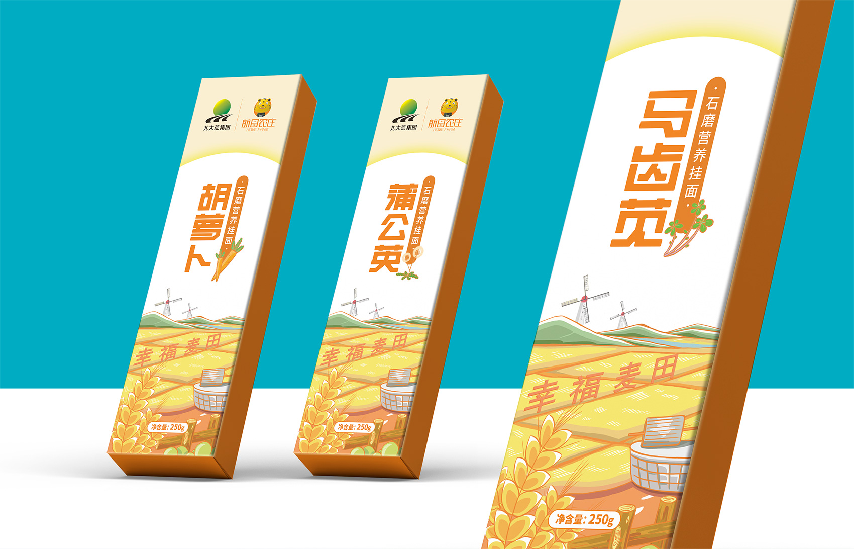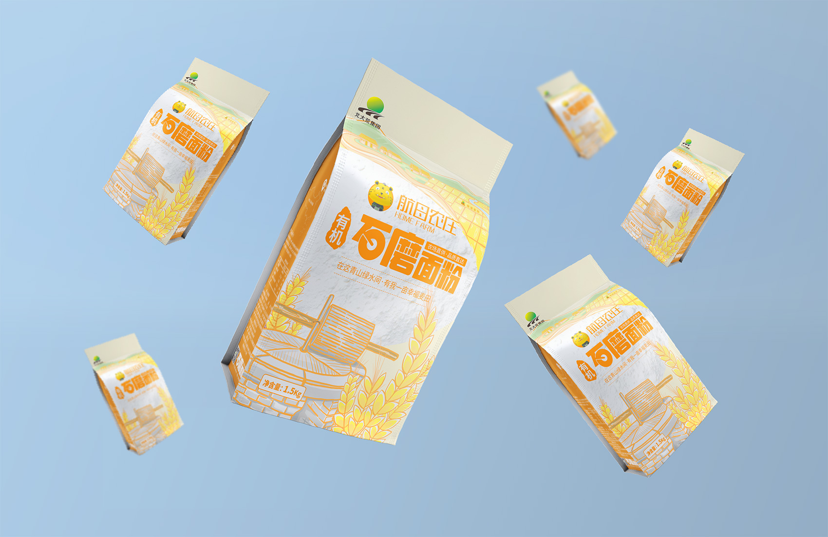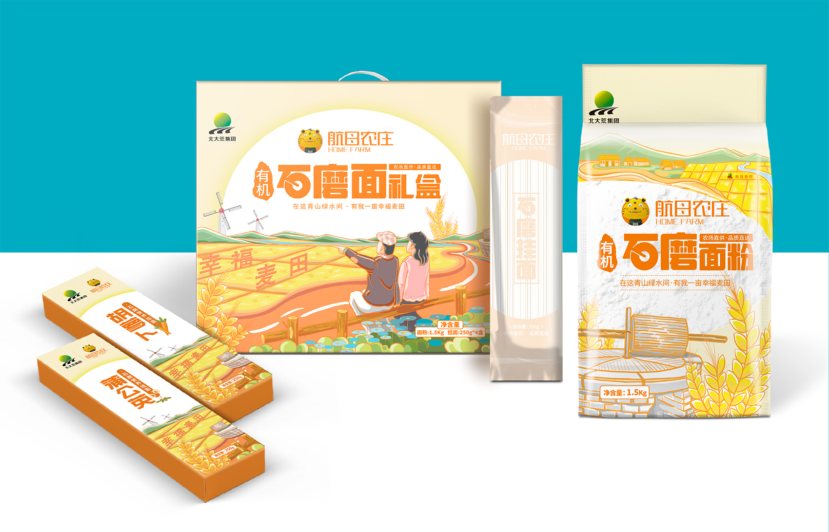 石磨面粉的產地位于有著“小江南”的建邊農場,產品使用傳統石磨加工,在低溫狀態下研磨面粉,使得面粉中的大部分營養成分得以保留,而這種慢工出細活的生產方式造就了產品的優良品質,也與品牌提倡的綠色生活相呼應,繽策將這種慢生活的品牌內核通過手繪插畫進行表達,將攜手相依在夕陽下,遙望燦爛金黃的麥浪翻滾,在周圍青山綠水的環繞下的幸福場景,色彩飽滿穩重,筆觸細膩,讓人浮想聯翩,仿佛麥香撲面而來。