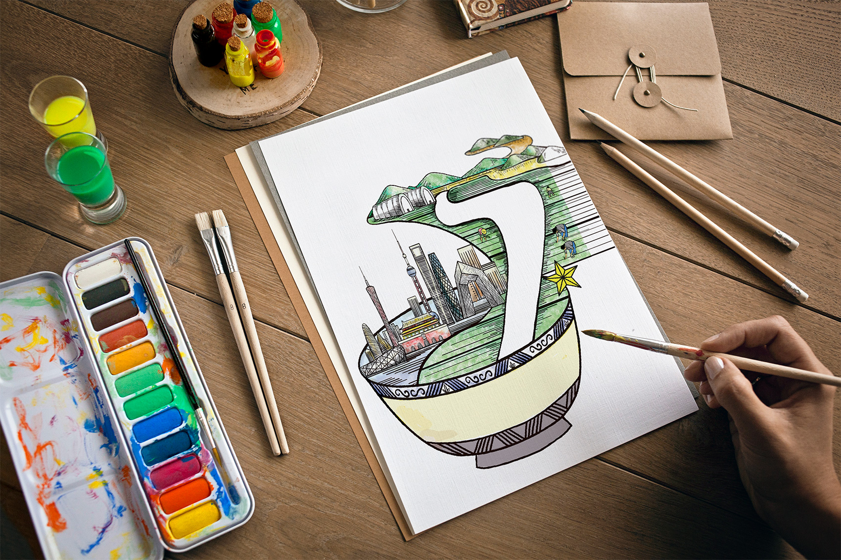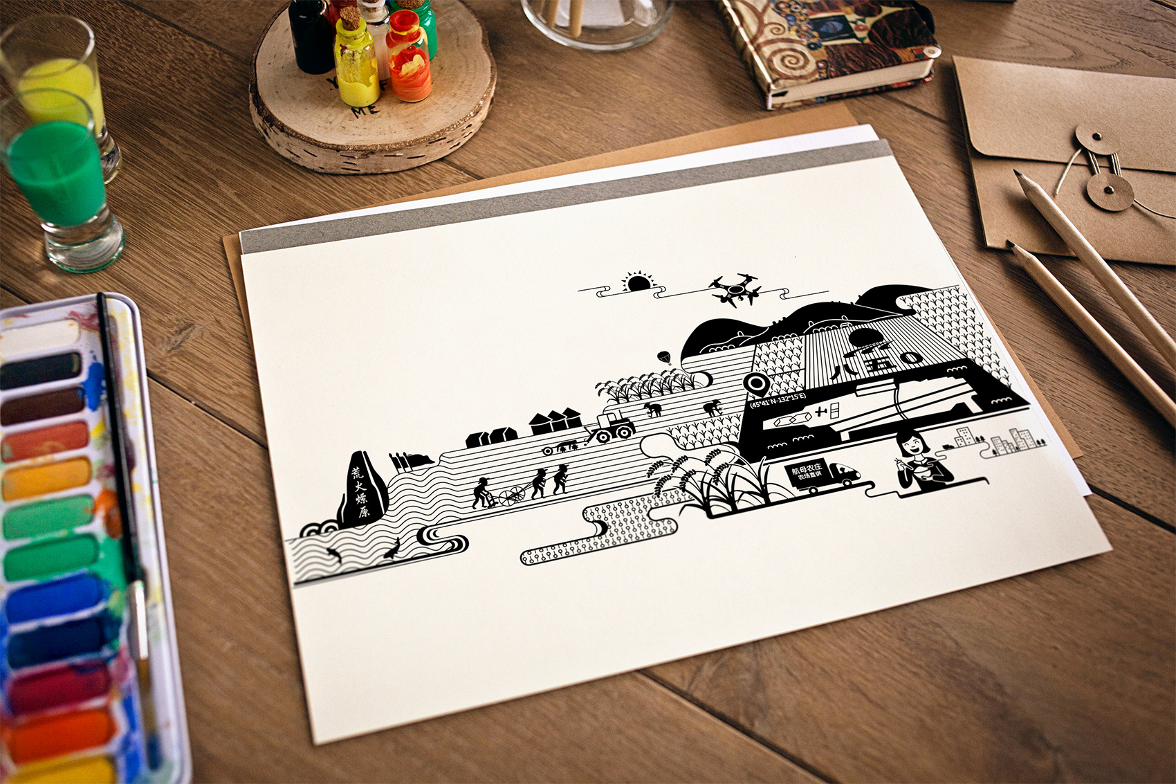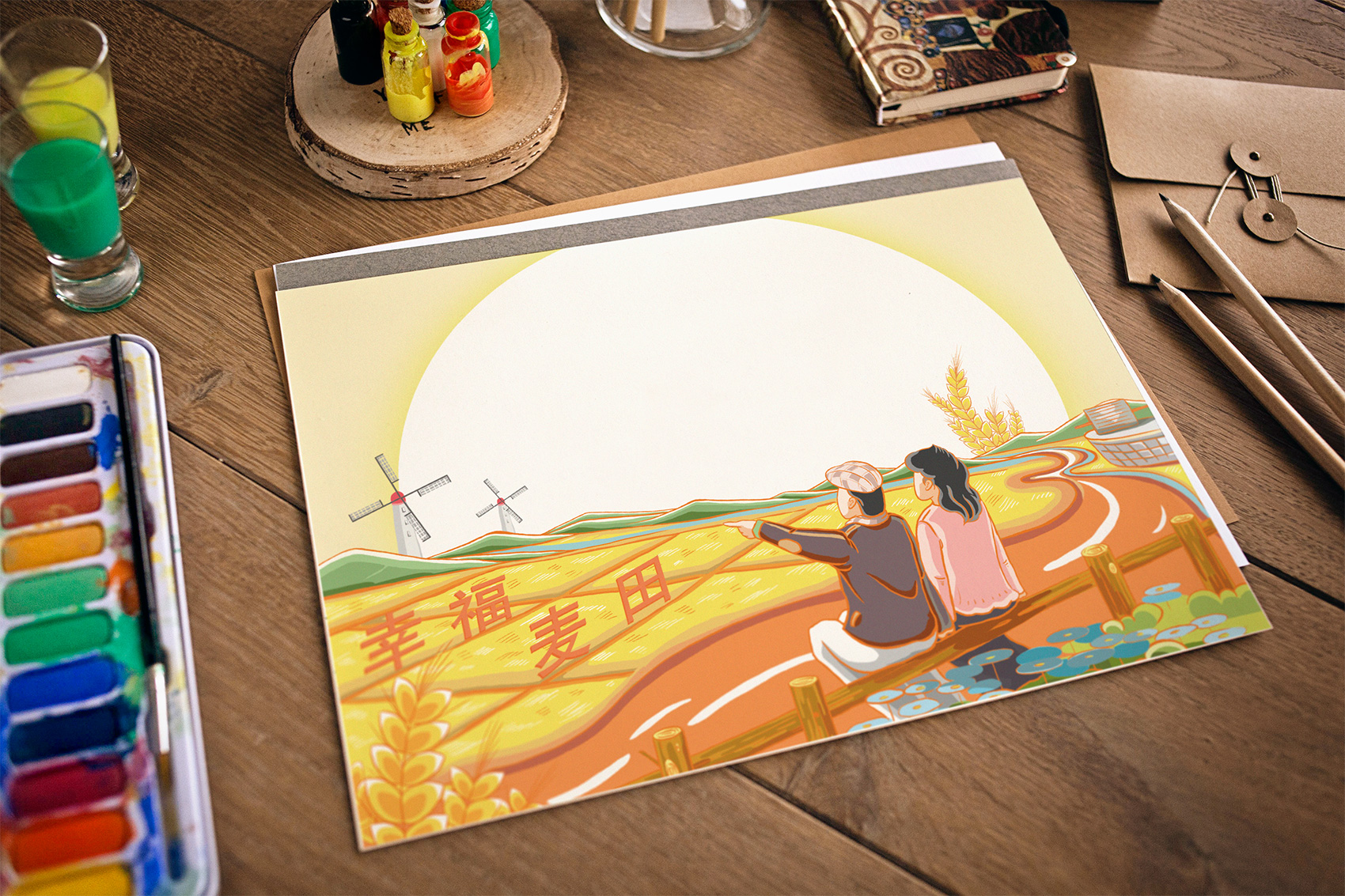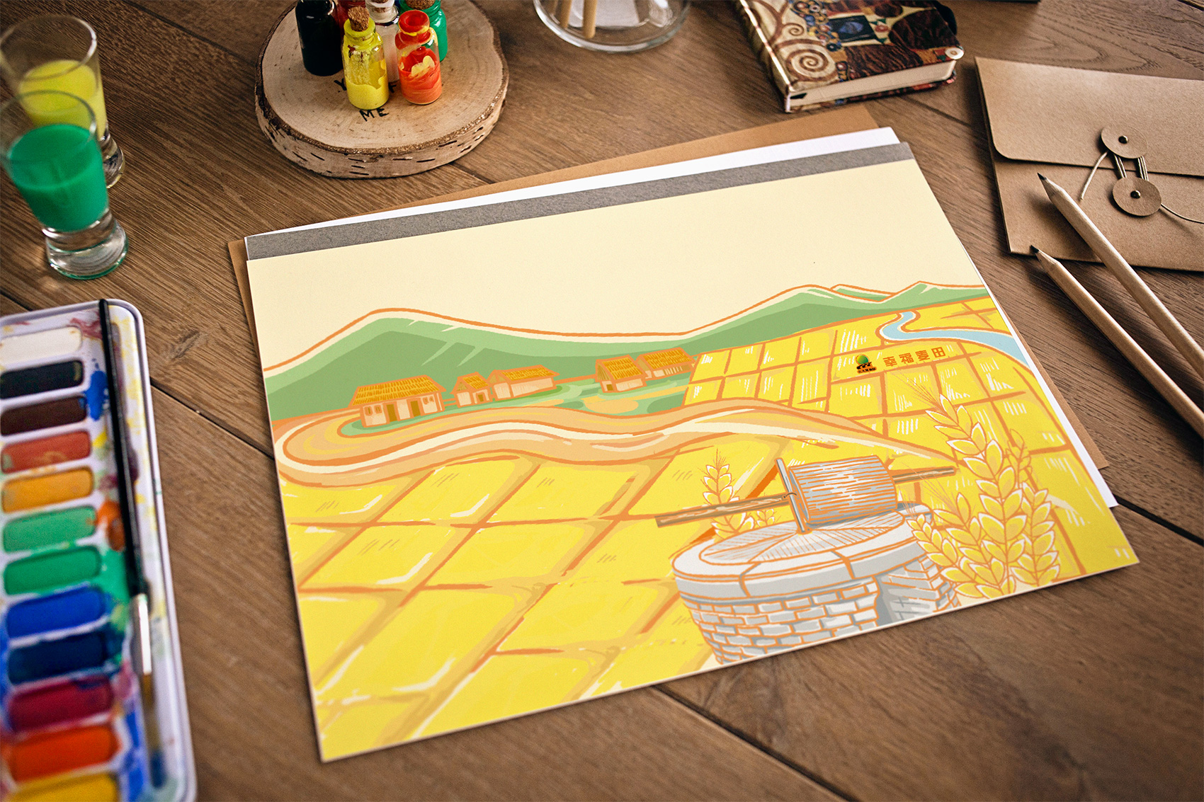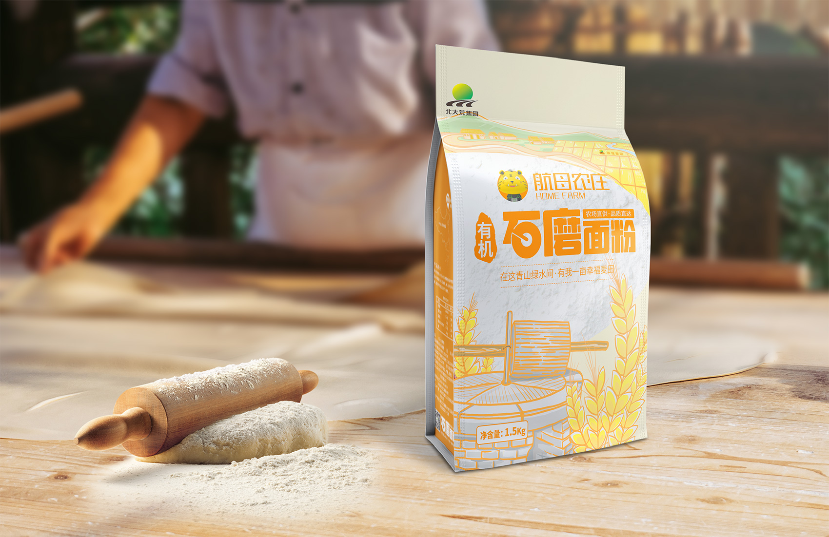 石磨面粉的產地位于有著“小江南”的建邊農場,產品使用傳統石磨加工,在低溫狀態下研磨面粉,使得面粉中的大部分營養成分得以保留,而這種慢工出細活的生產方式造就了產品的優良品質,也與品牌提倡的綠色生活相呼應,繽策將這種慢生活的品牌內核通過手繪插畫進行表達,將攜手相依在夕陽下,遙望燦爛金黃的麥浪翻滾,在周圍青山綠水的環繞下的幸福場景,色彩飽滿穩重,筆觸細膩,讓人浮想聯翩,仿佛麥香撲面而來。