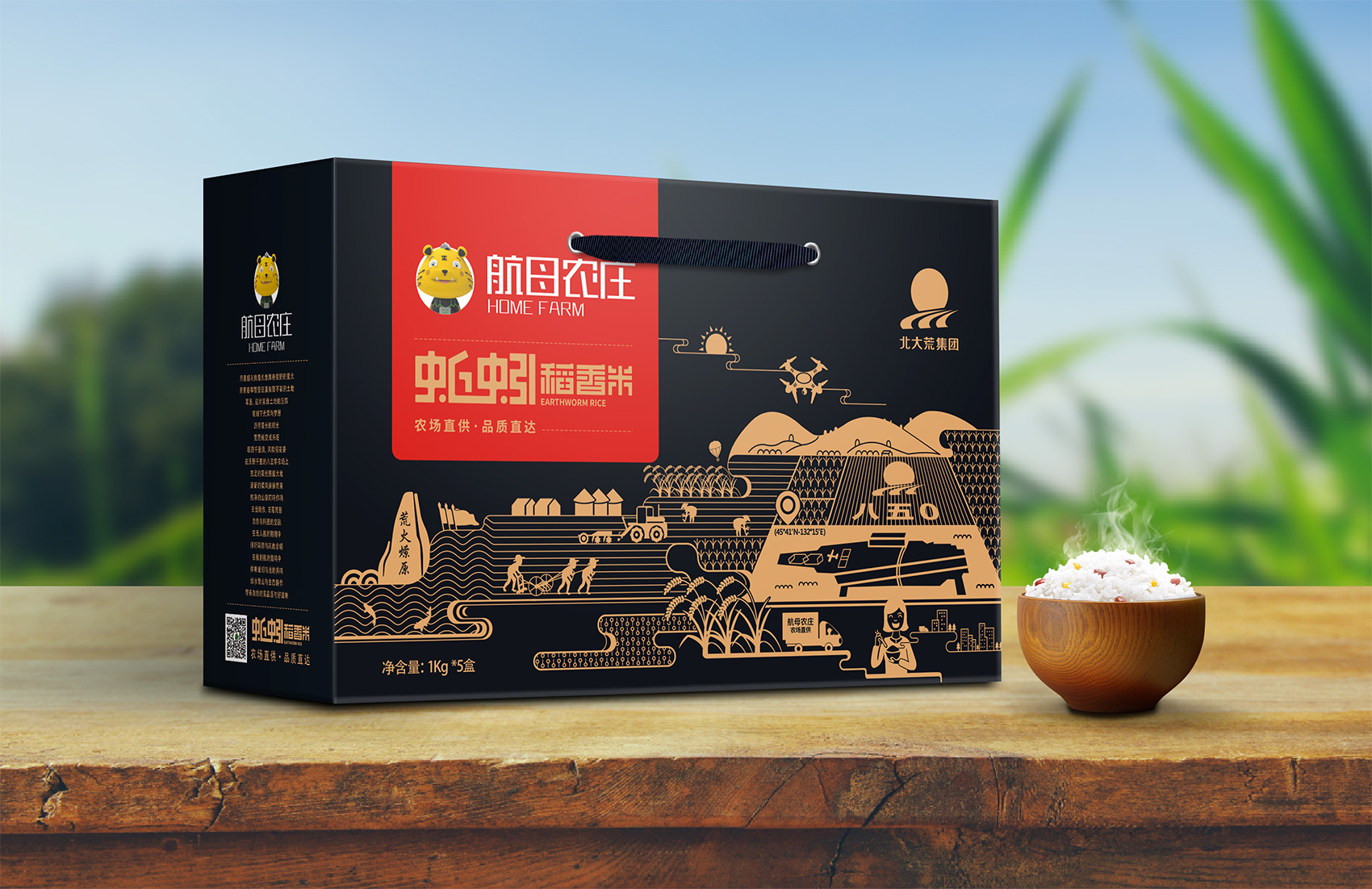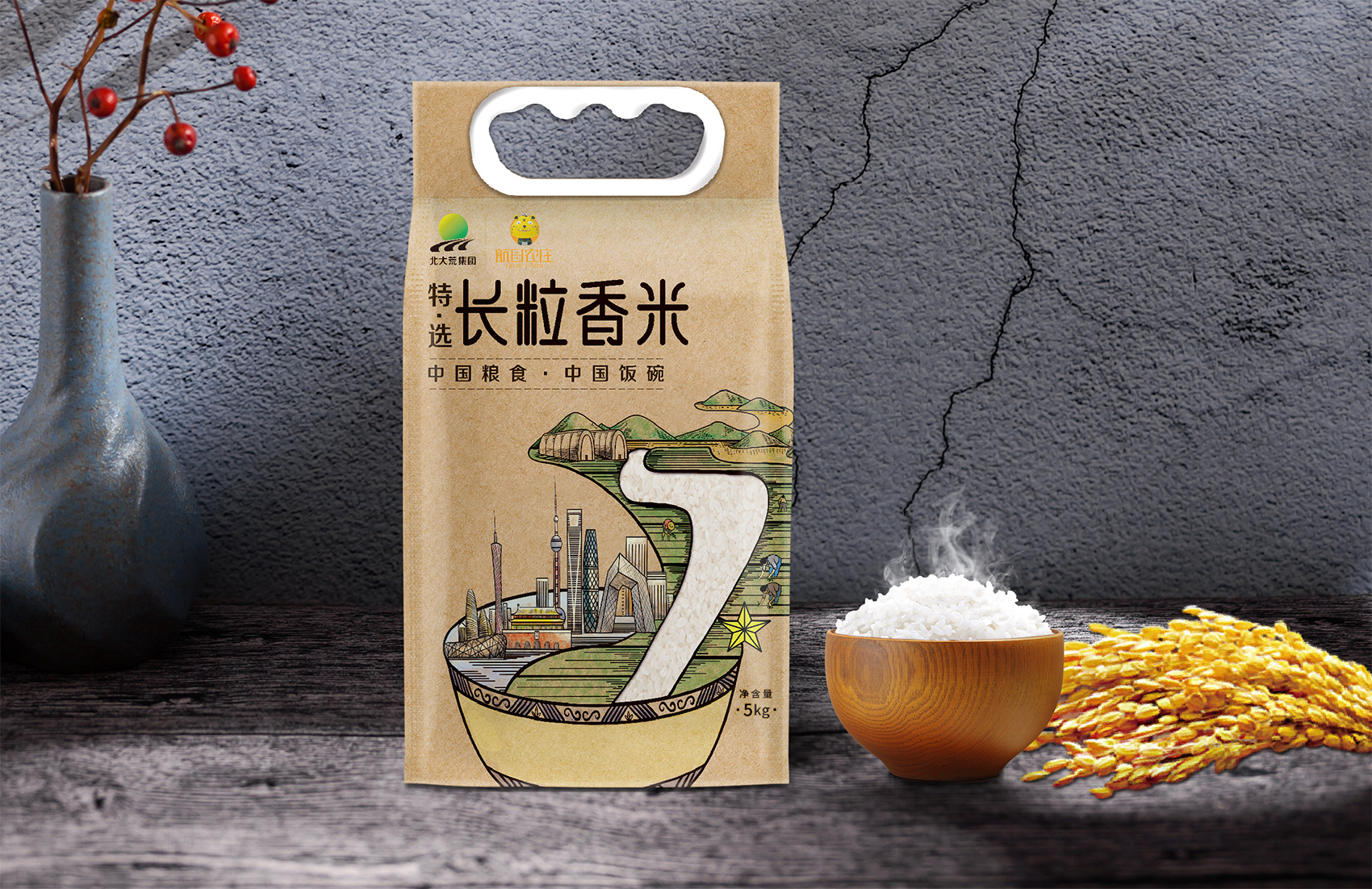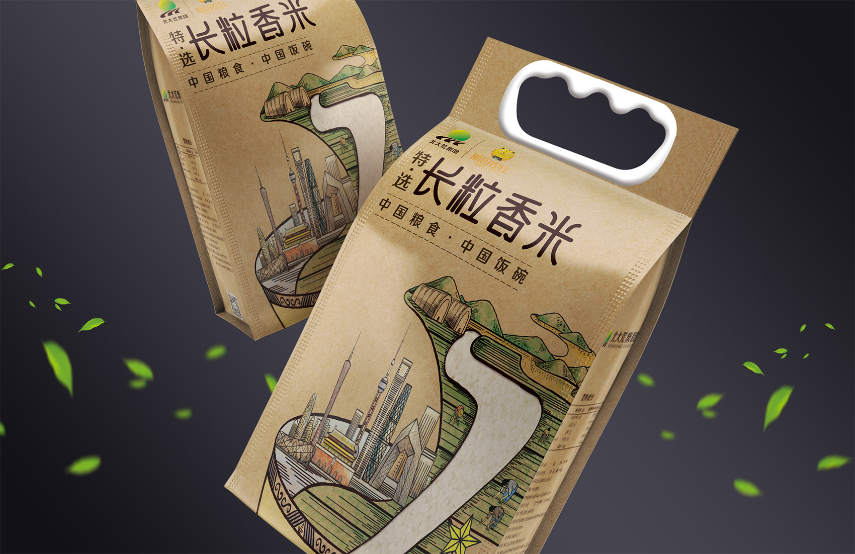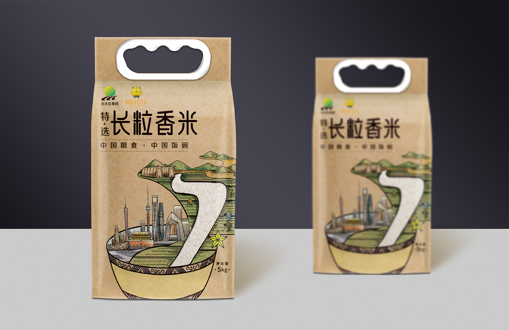 長粒香種植區位于七星農場,在習近平總書記考察后發表了著名的中國飯碗中國糧的講話,“北大荒為中國人真正解決溫飽問題發揮了大作用,我們一定要保護好黑土地,保護好中國飯碗。中國人要把飯碗端在自己手里,而且要裝自己的糧食?!崩_策采用類版畫風格的插畫來表現從農場直接到飯碗中的品牌核心價值,優質的綠水青山自然環境之下生產出高品質好滋味的長粒香,中間的鏤空部分既象征著產品的產地——七星農場,也象征著運送產品的廣闊道路,形成令人記憶深刻的超級符號;在碗中的地標性建筑物代表全國各地,寓意企業寬廣美好的未來;整體包材采用環保牛皮紙,在提升了質感與手感的同時,也能在同質化的包裝中脫穎而出。