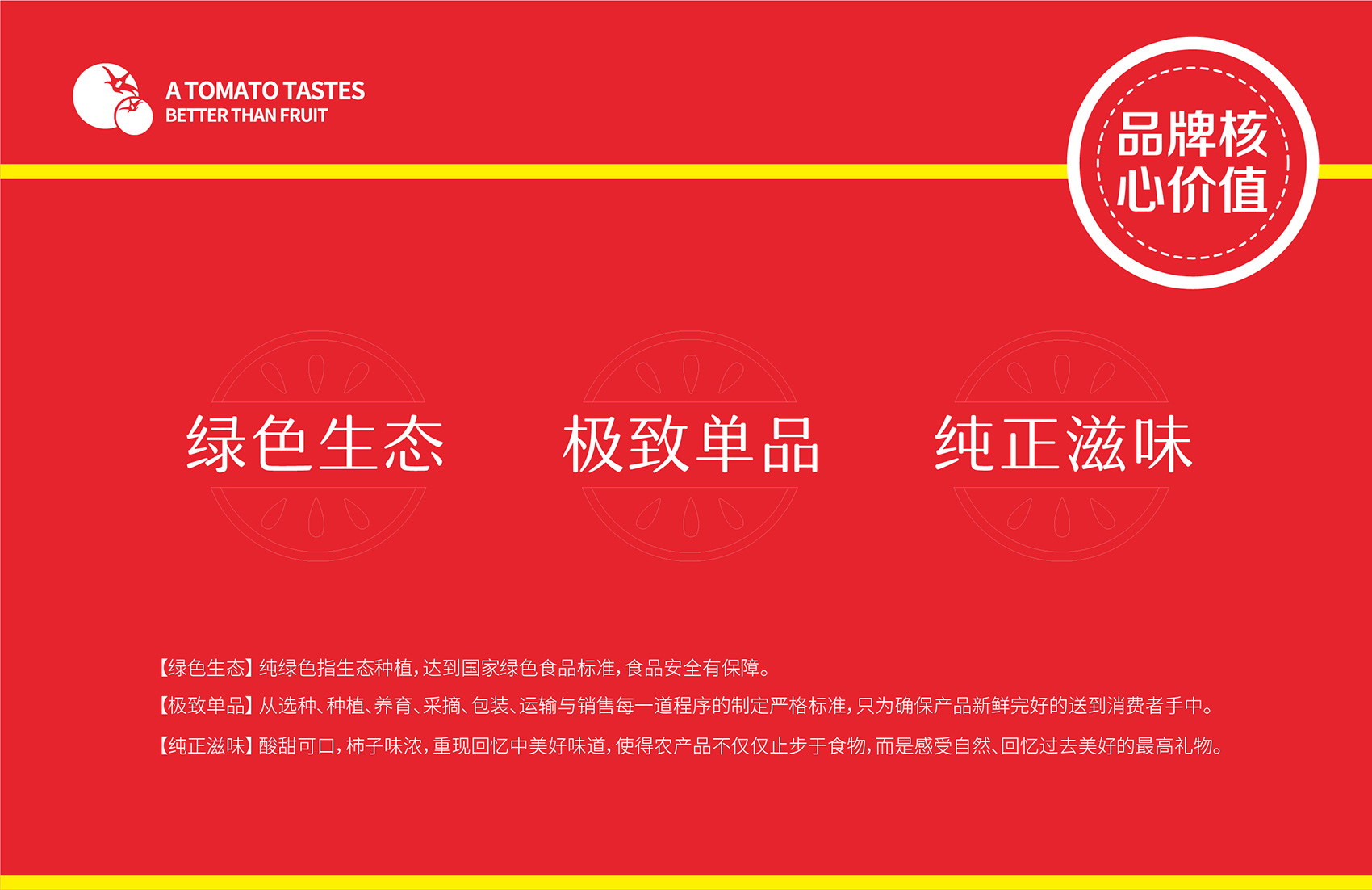 針對番佬大綠色生態番茄的定位,繽策提煉出純正為核心概念的文化體系,從品牌DNA開始不斷貫穿番佬大番茄的美好滋味,針對目標消費人群的審美偏好,以質樸平實的語言風格構建出綠色生態番茄的立體體系,slogan為“比水果還好吃的番茄”,不僅針對消費者做出品質的承諾與保證,讓消費者能清楚明了的了解番佬大值得信賴的原因,更是對企業內部的要求,指明了企業未來的發展方向,持續不斷的為百姓提供綠色健康,安全美味的品質番茄。