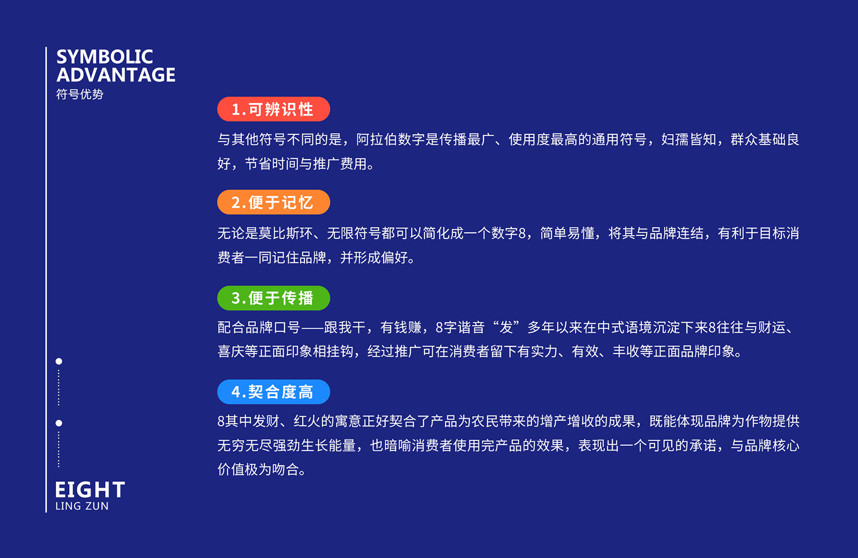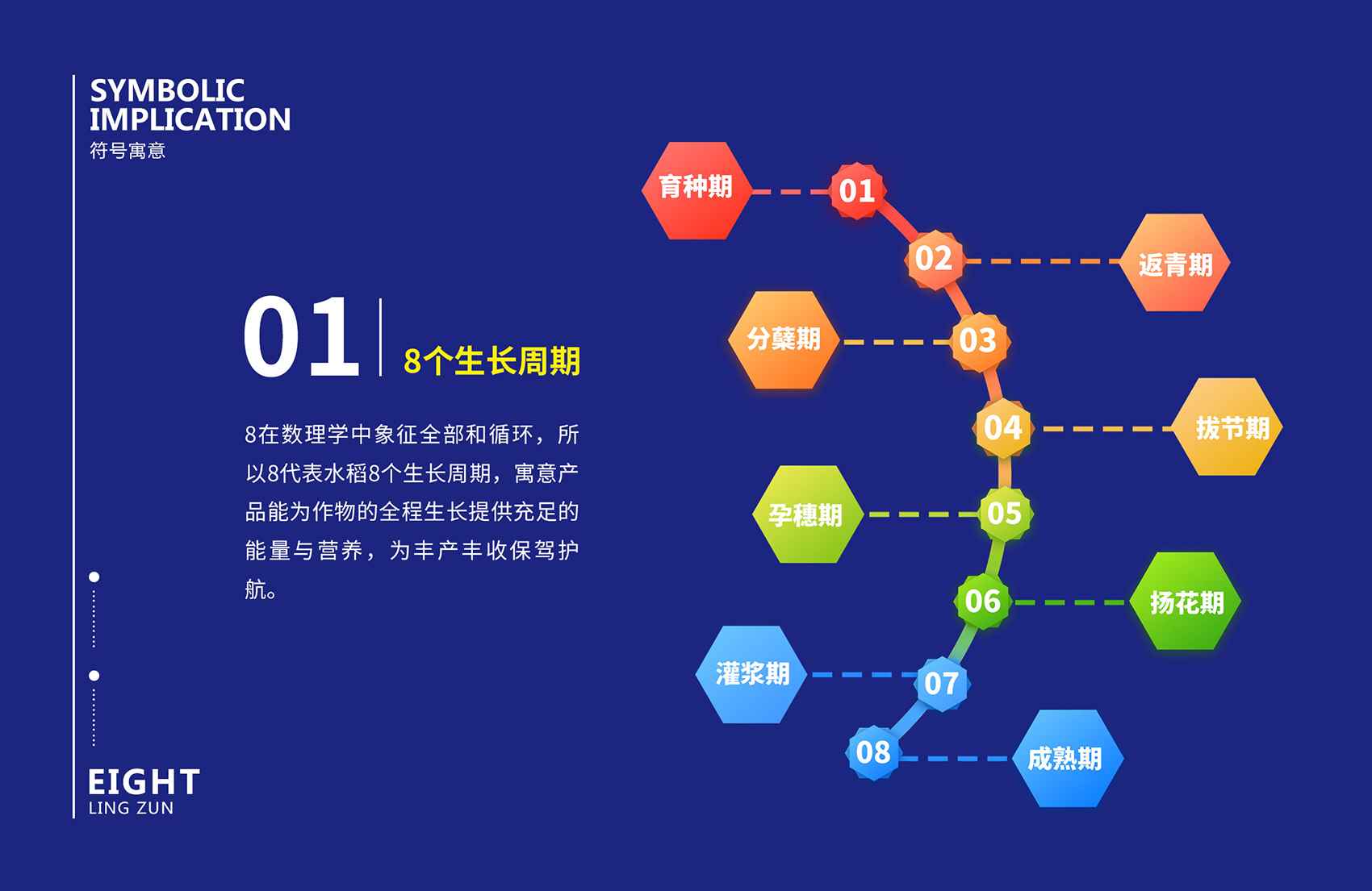 首先這一符號認知度廣泛,老幼皆知,而且能夠凝聚成一個短笑精悍的詞語,在傳播中可以有效減少損耗,便于記憶與推廣;此外將這個8放倒,就變成了代表無限的符號,予以品牌能夠為作為帶來無窮無盡的能量,而在國人心中8與“發”諧音,代表發達興旺,向消費者傳遞品牌能夠帶來豐收與財富,幫助農民發家致富,也是品牌助農致富不變的承諾,直指品牌核心價值。8在數理中也代表全部與循環,寓意水稻的8個生長周期,表達了產品能夠為作物的全程勝仗提供充足的能量與營養,為豐產豐收保駕護航。