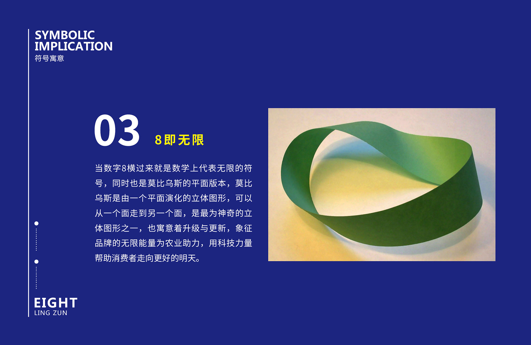 豐收一直是農民奮斗的目標,而肥料正是豐產增收的重要組成部分,從領尊的品牌廣告——引領時代,至尊科技可以看出,品牌在肥業的雄心壯志與宏大遠景,以科技力量引領農業發展進步,為農民保駕護航,這份使命與責任帶來的尊貴源自企業過硬的產品品質,所以消費者最希望看到的品牌核心價值就是肥料能夠擁有強勁能力,保證豐收增產,碩果累累。從這一角度入手,繽策思考能將看不見摸不到的能量用消費者熟悉的符號表現出來,能量是因,豐收是果,而新的果實又將變為種子再次播撒到田野中,四季輪轉中開始循環,所以阿拉伯數字8成為了代表領尊的超級符號。