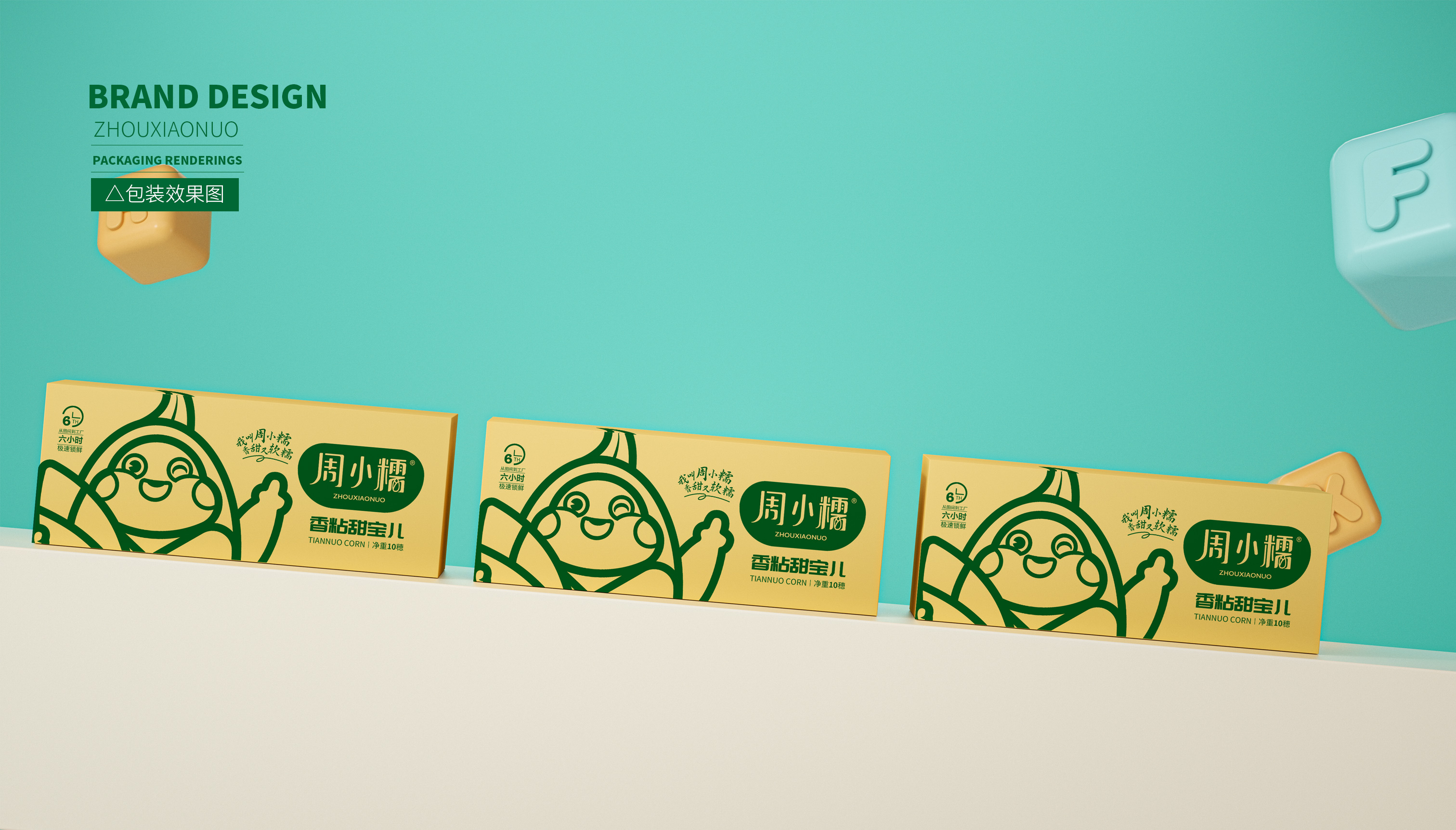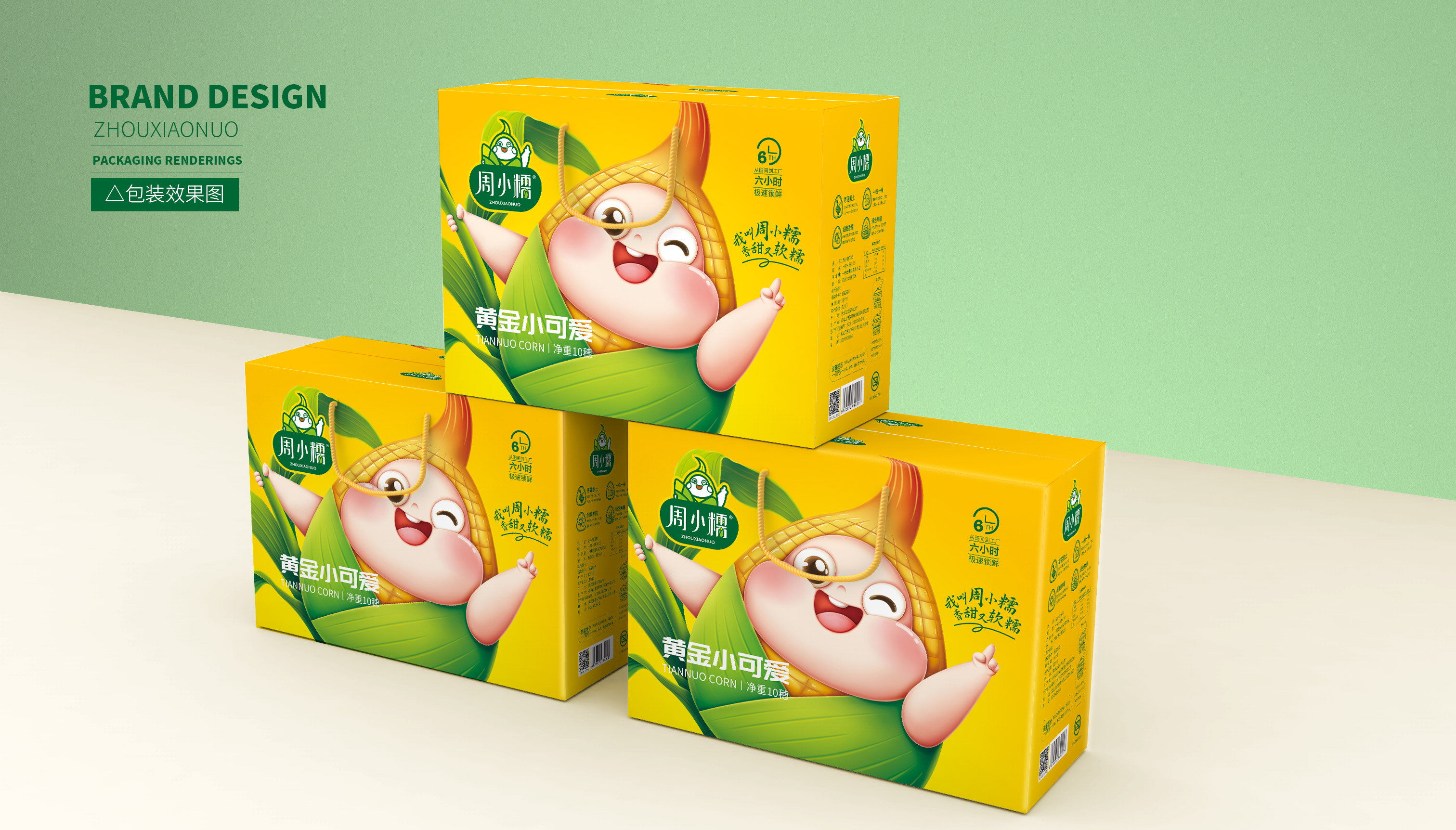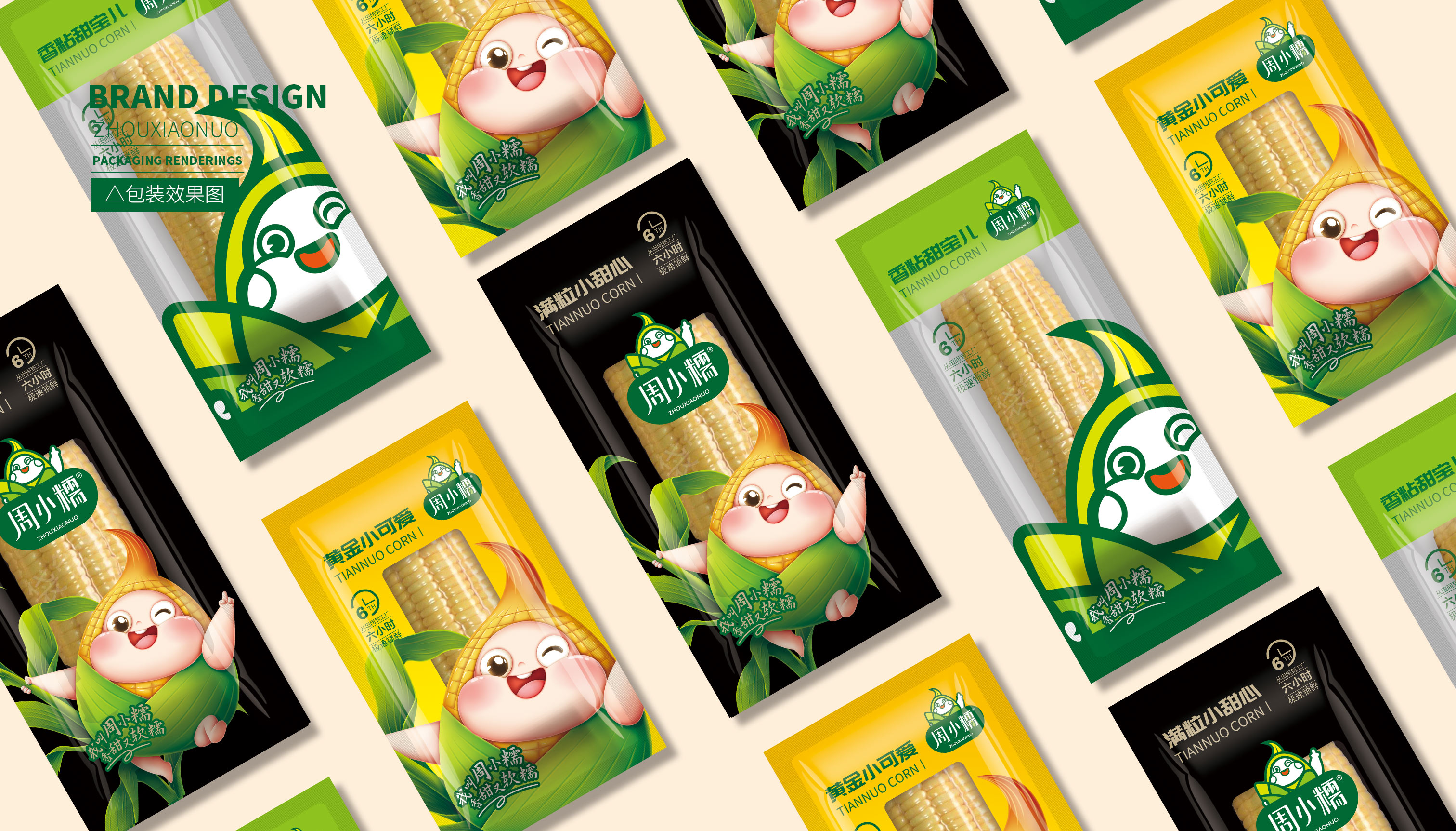 通過大量市場調研,繽策發現鮮食玉米的主要消費者為女性,主流品牌包裝以種植場景插畫或擬人化IP為主,風格為年輕消費者喜愛的小清新。在設計層面,品牌logo及相關符號多數并不突出,畫面同質化較為嚴重,消費者很難分辨品牌之間的差別。經過多輪頭腦風暴的研討,繽策將從品牌名稱本身入手,打造差異化IP形象,并延展到logo與包裝上,使得品牌更加整體化,最大程度的提升傳播效率,讓消費者切實記住品牌,在同類競品中脫穎而出。