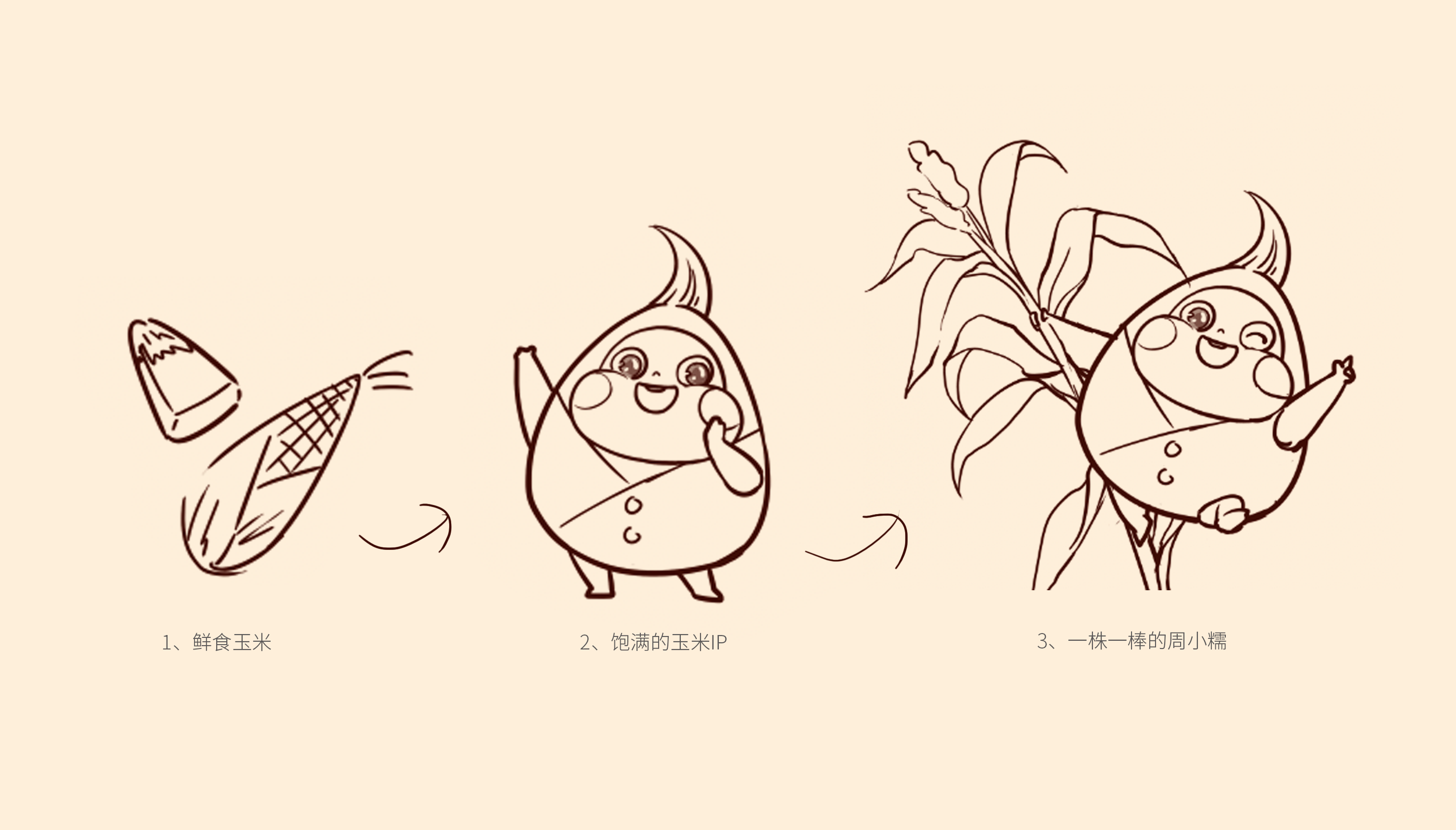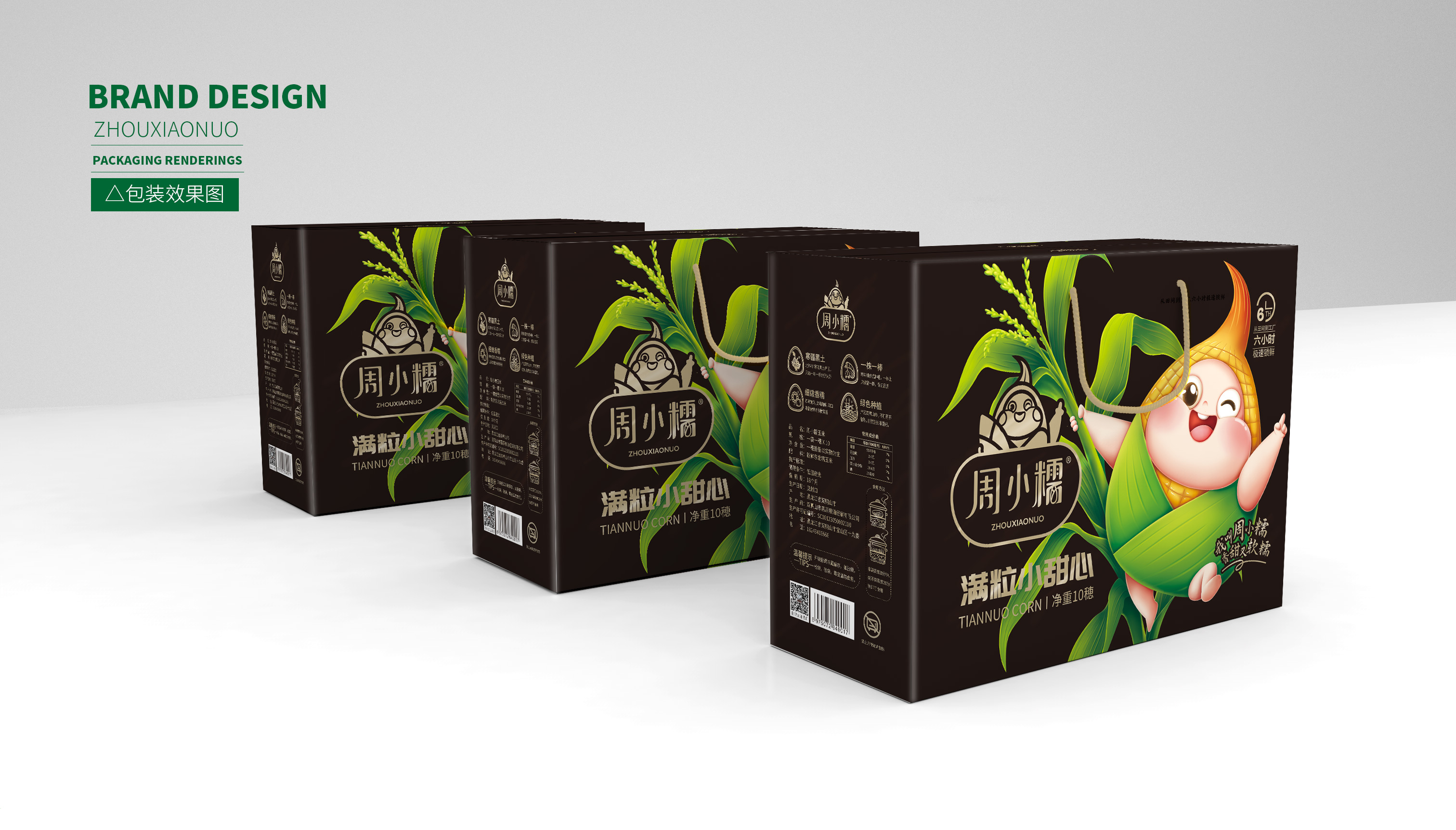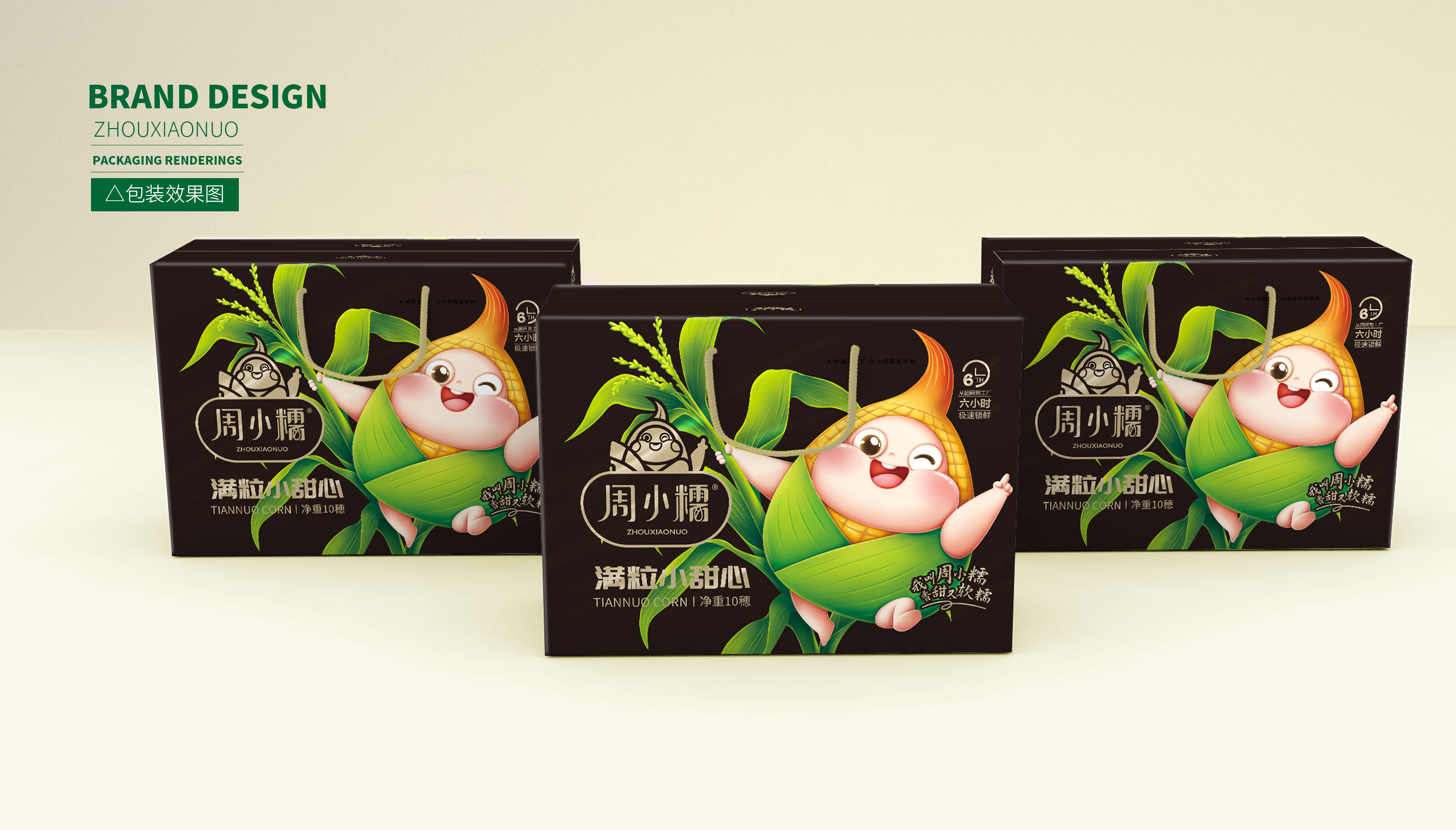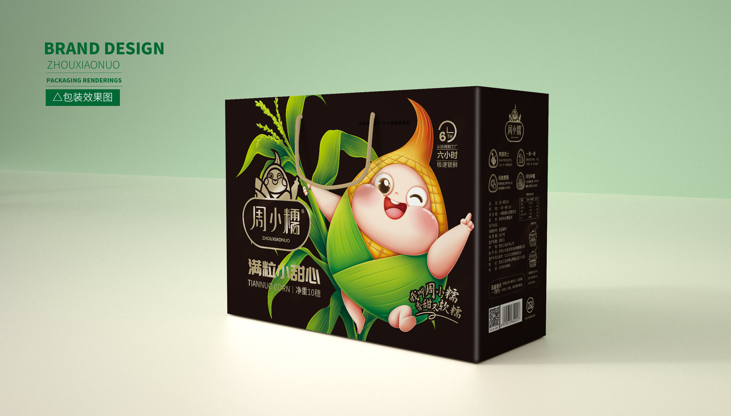 通過大量市場調研,繽策發現鮮食玉米的主要消費者為女性,主流品牌包裝以種植場景插畫或擬人化IP為主,風格為年輕消費者喜愛的小清新。在設計層面,品牌logo及相關符號多數并不突出,畫面同質化較為嚴重,消費者很難分辨品牌之間的差別。經過多輪頭腦風暴的研討,繽策將從品牌名稱本身入手,打造差異化IP形象,并延展到logo與包裝上,使得品牌更加整體化,最大程度的提升傳播效率,讓消費者切實記住品牌,在同類競品中脫穎而出。