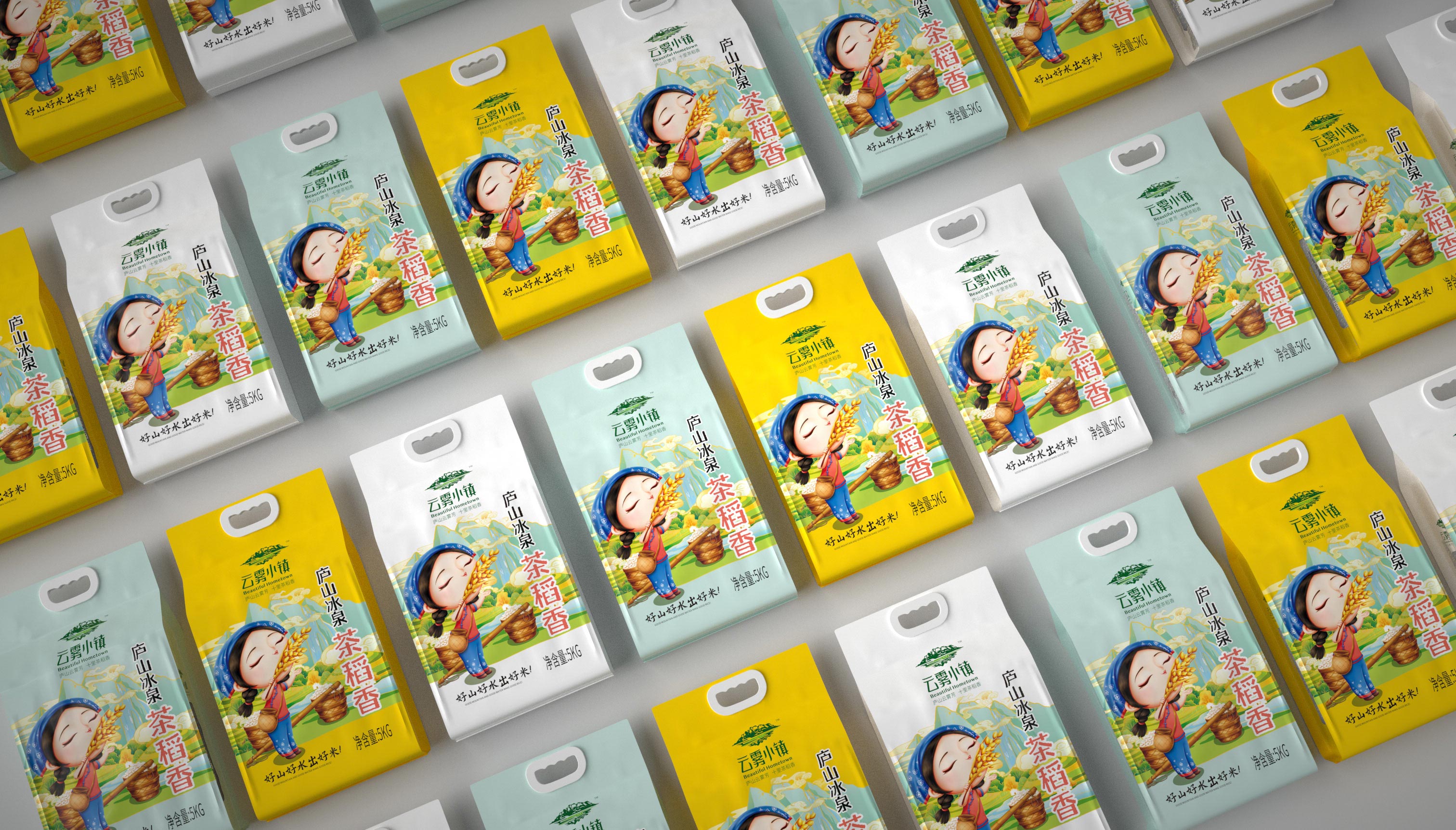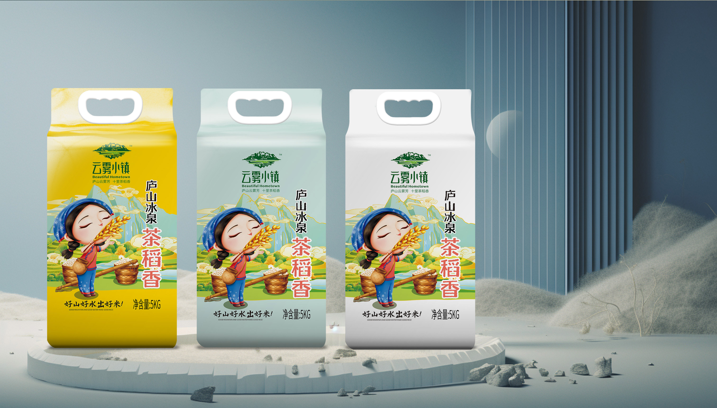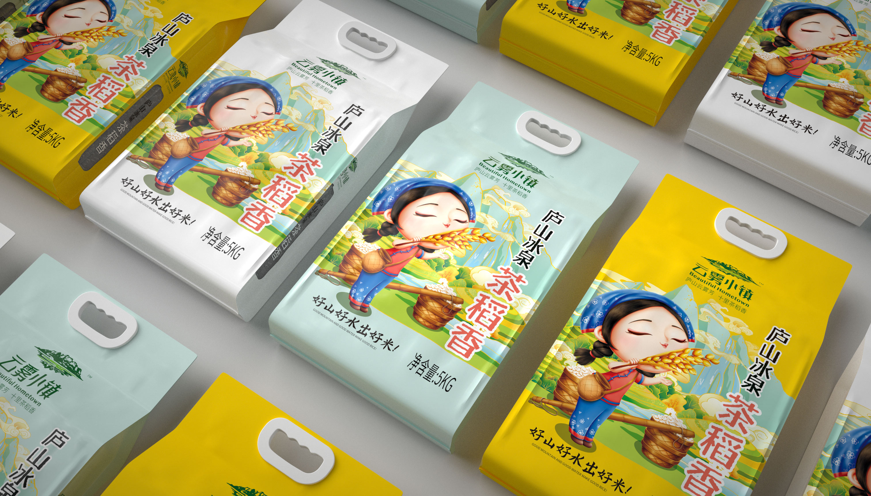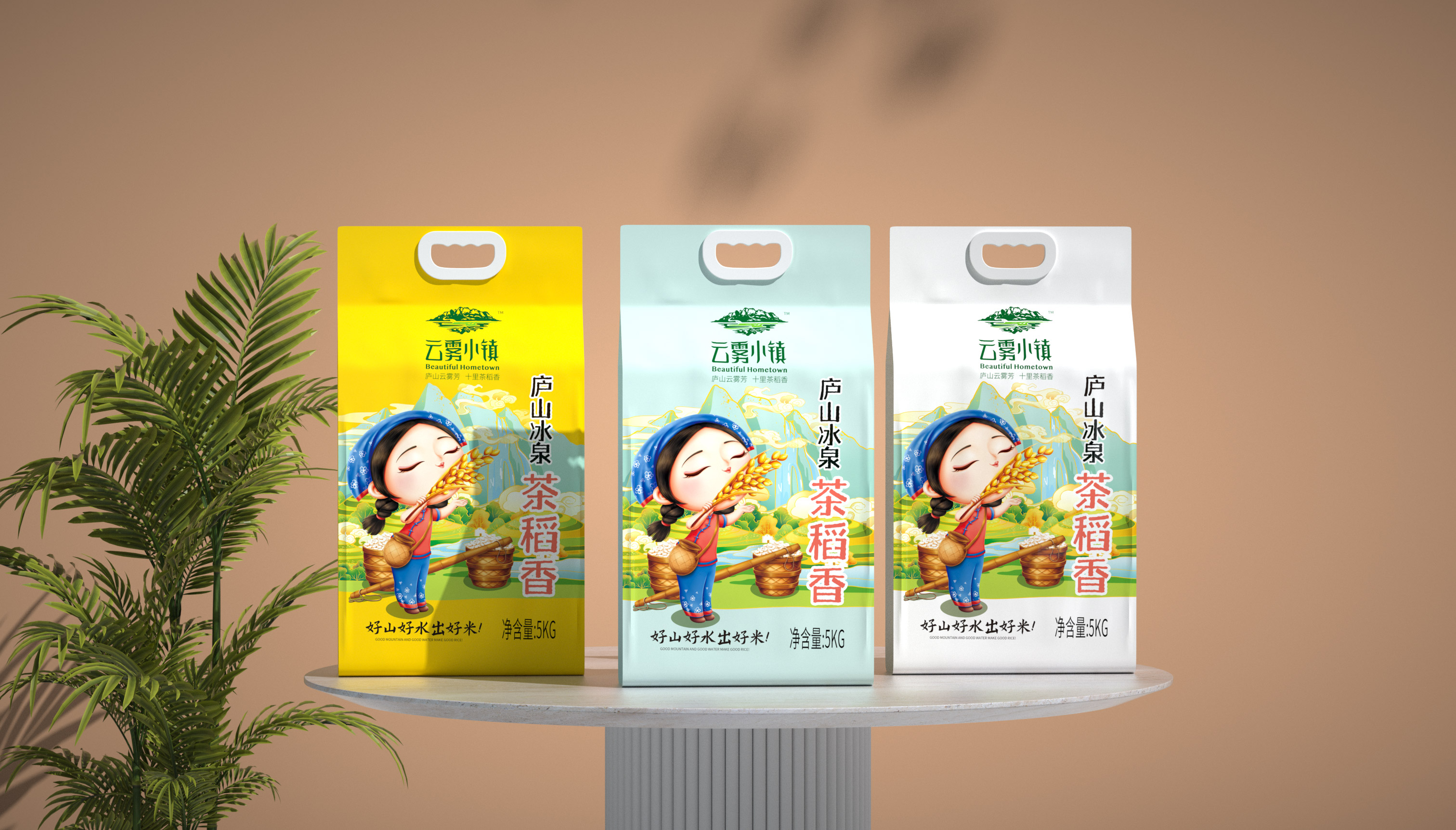 作為地域性品牌,云霧小鎮歸屬于較為具象的名詞,同時也是產品的自然生長環境,在傳播與認知層面上越具體的元素越能讓消費者記住,以產品產地廬山五老峰為主體,展現出稻場云海霧罩、青山秀水的得天獨厚的自然環境,凸顯地域特色,進而將品牌與自然品質相掛鉤;同時此處大米與其他競品最大的區別,就是產地周圍茶園眾多,可以說稻米是在茶香的熏陶下長大的,所以提煉出“茶稻”的概念,將純凈自然、高品質等品牌印象蘊含其中,創作出“廬山云霧芳,十里茶稻香”的slogan,并以此為核心延展包裝及IP,幫助品牌系統化的搭建基礎框架。
