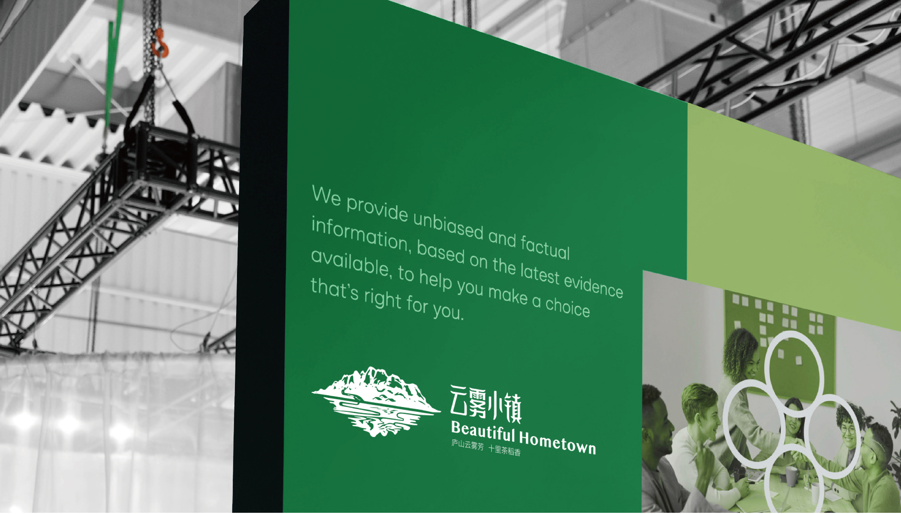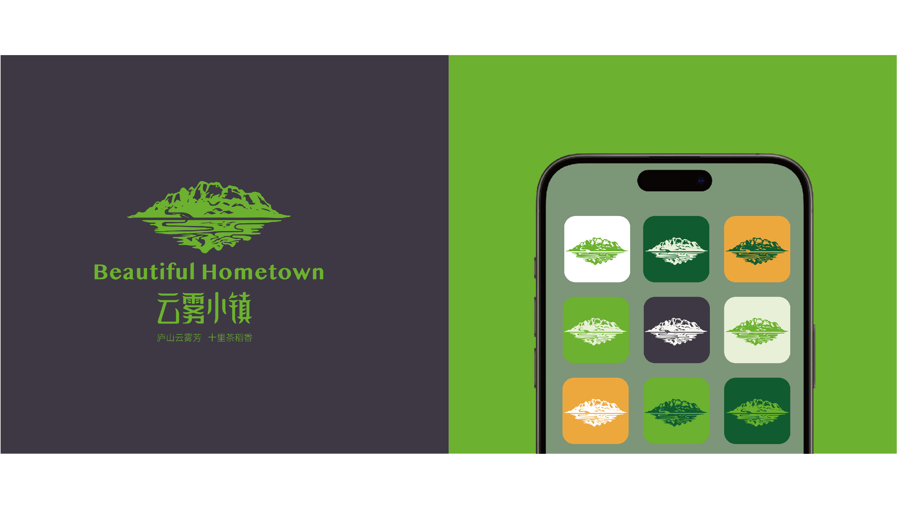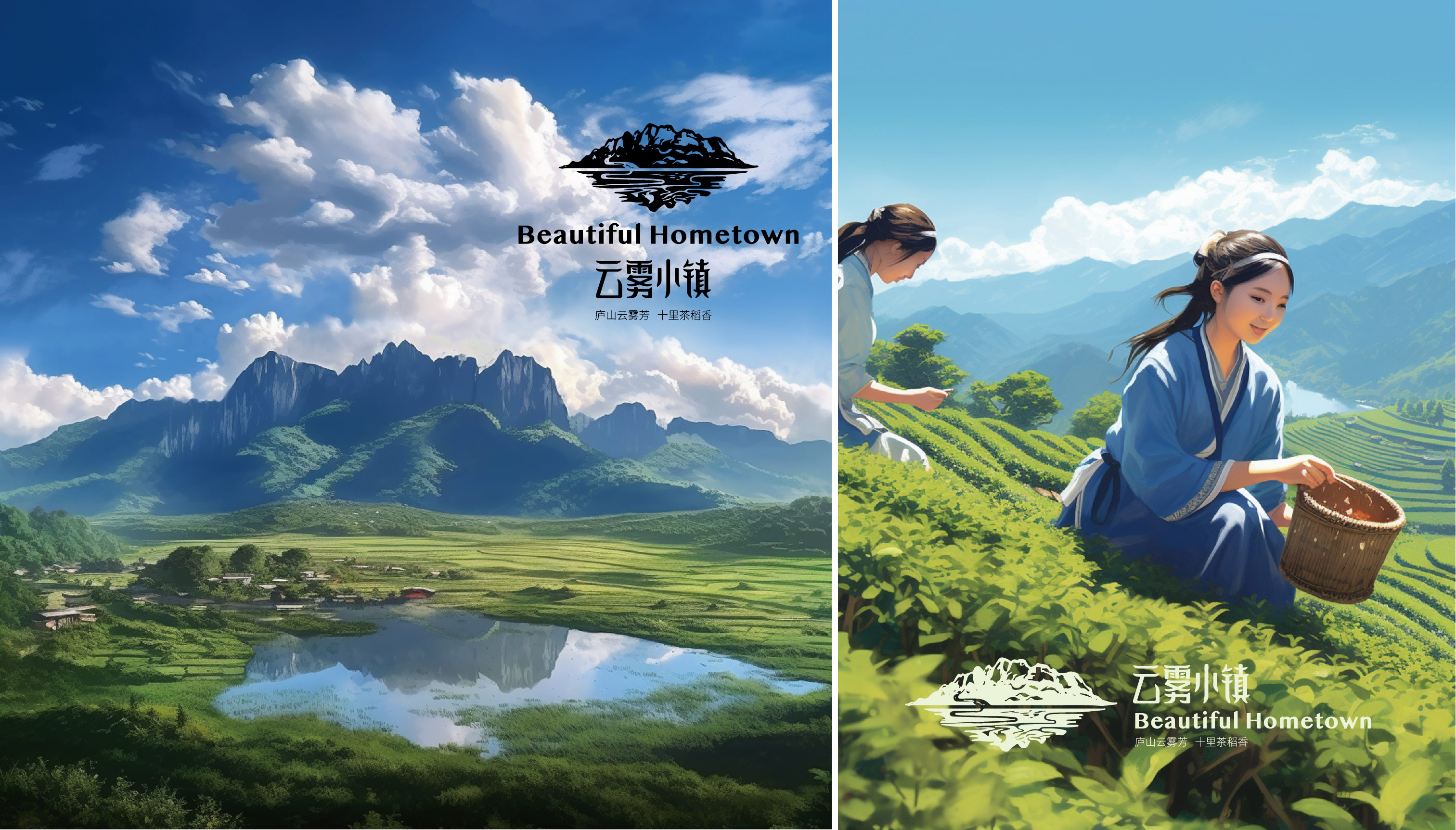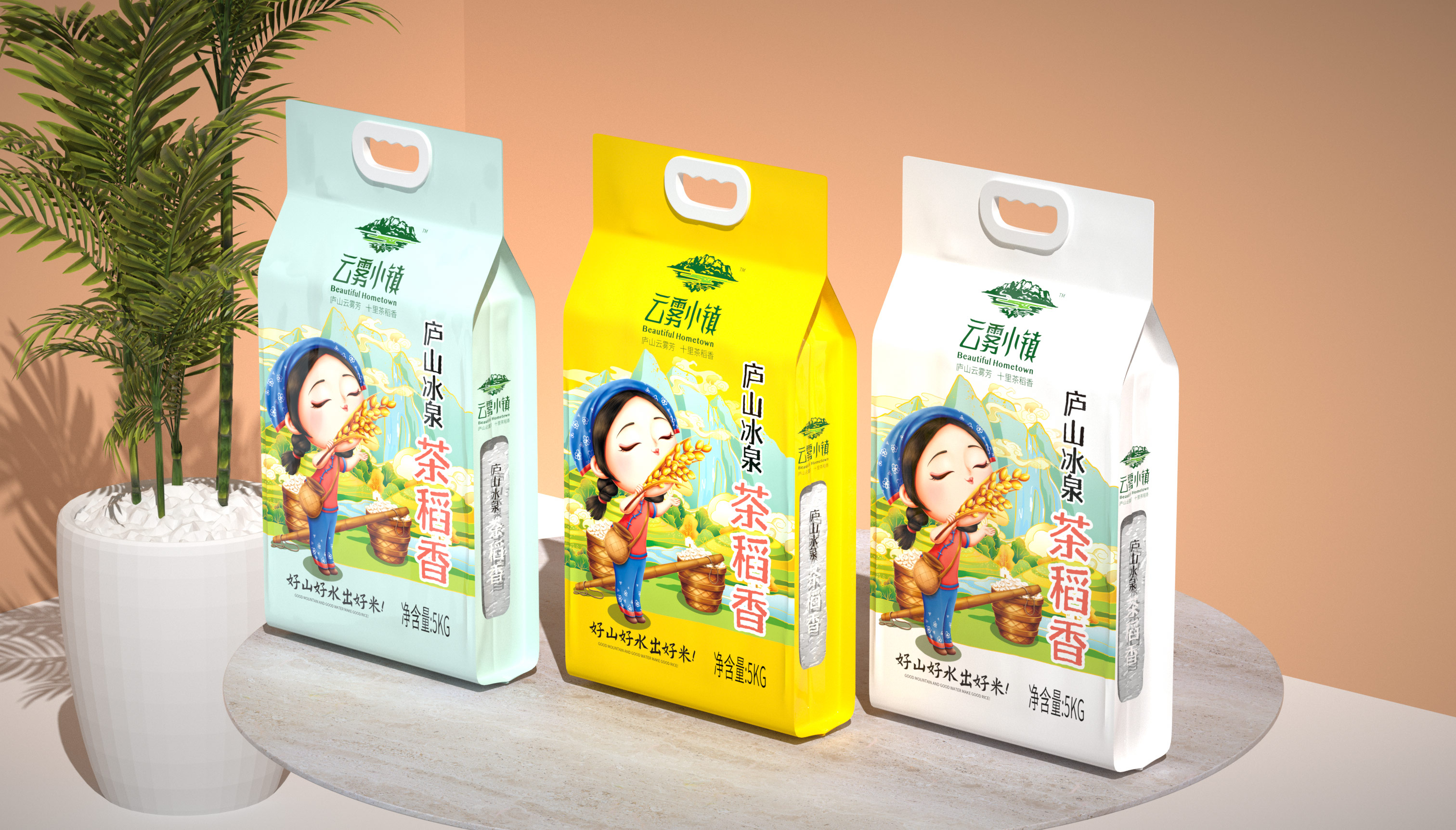作為地域性品牌,云霧小鎮歸屬于較為具象的名詞,同時也是產品的自然生長環境,在傳播與認知層面上越具體的元素越能讓消費者記住,以產品產地廬山五老峰為主體,展現出稻場云海霧罩、青山秀水的得天獨厚的自然環境,凸顯地域特色,進而將品牌與自然品質相掛鉤;同時此處大米與其他競品最大的區別,就是產地周圍茶園眾多,可以說稻米是在茶香的熏陶下長大的,所以提煉出“茶稻”的概念,將純凈自然、高品質等品牌印象蘊含其中,創作出“廬山云霧芳,十里茶稻香”的slogan,并以此為核心延展包裝及IP,幫助品牌系統化的搭建基礎框架。