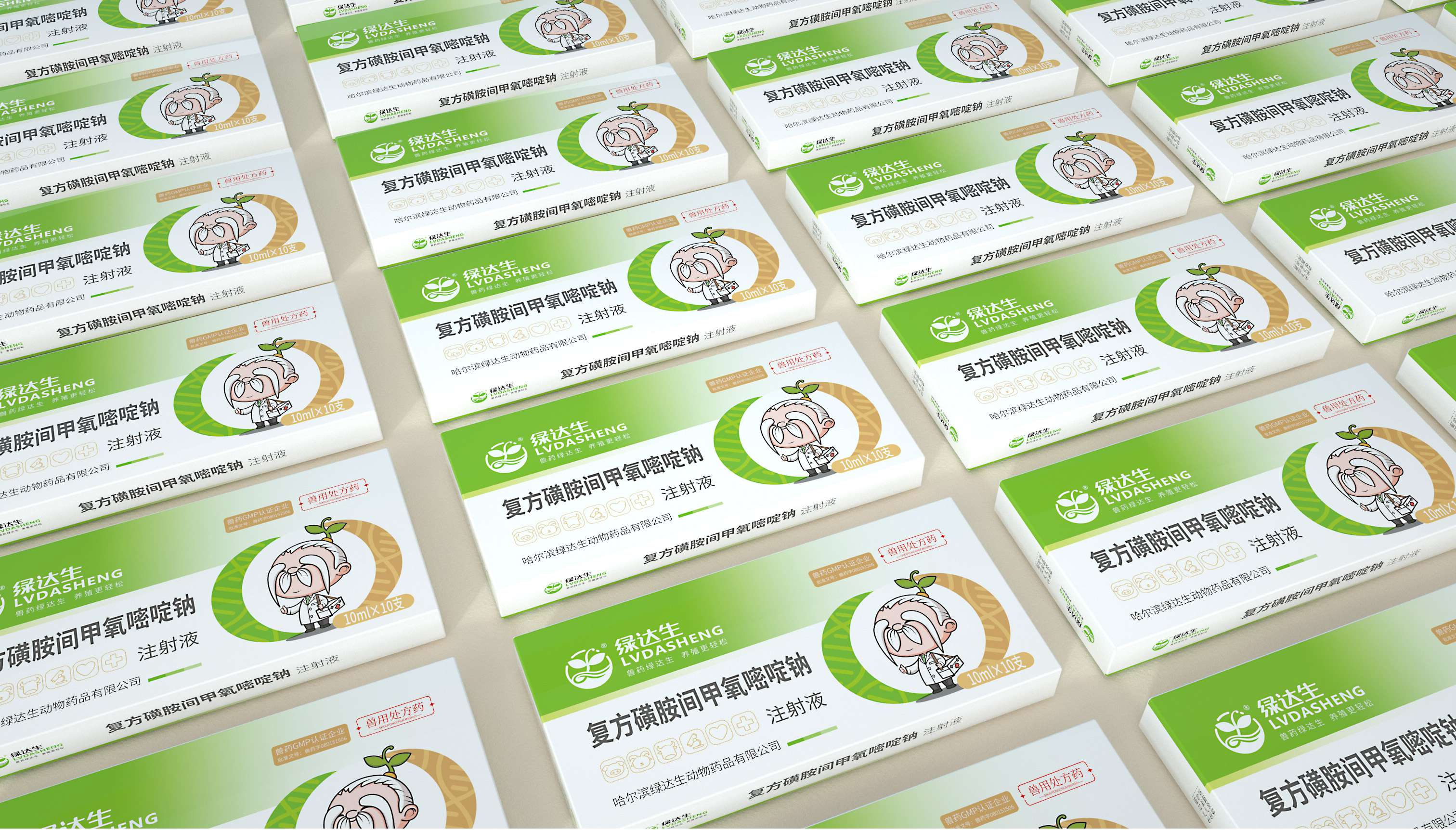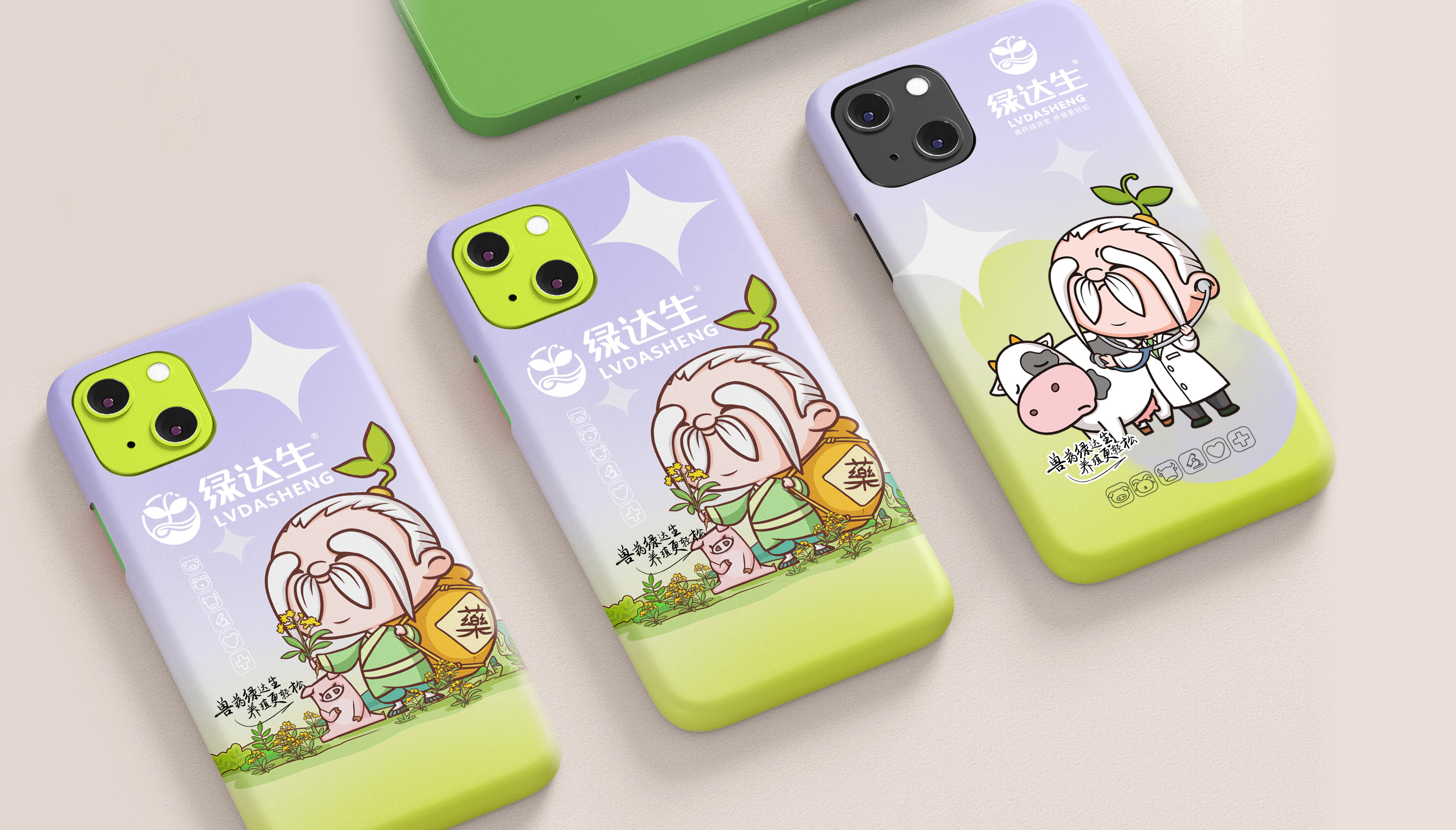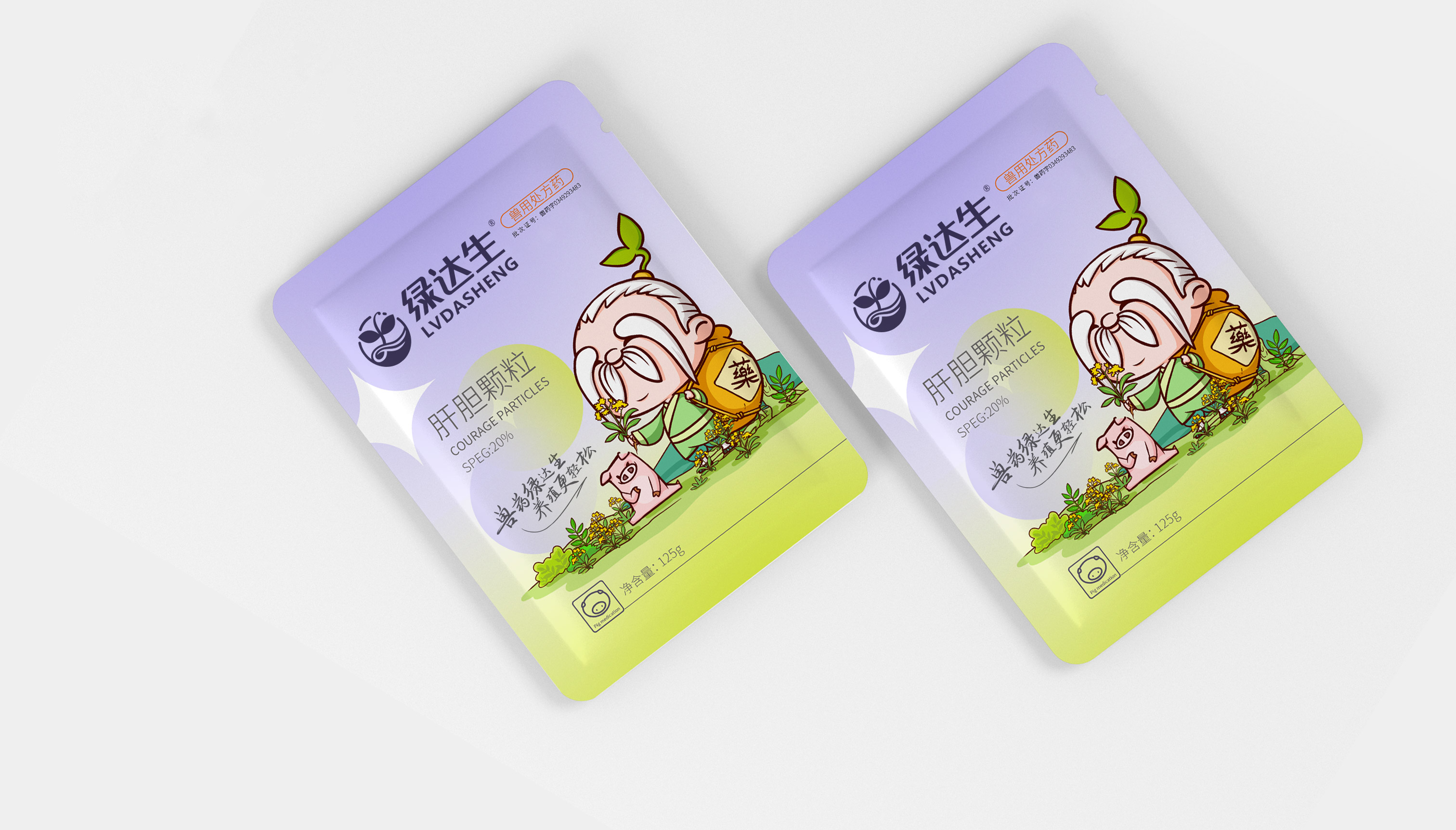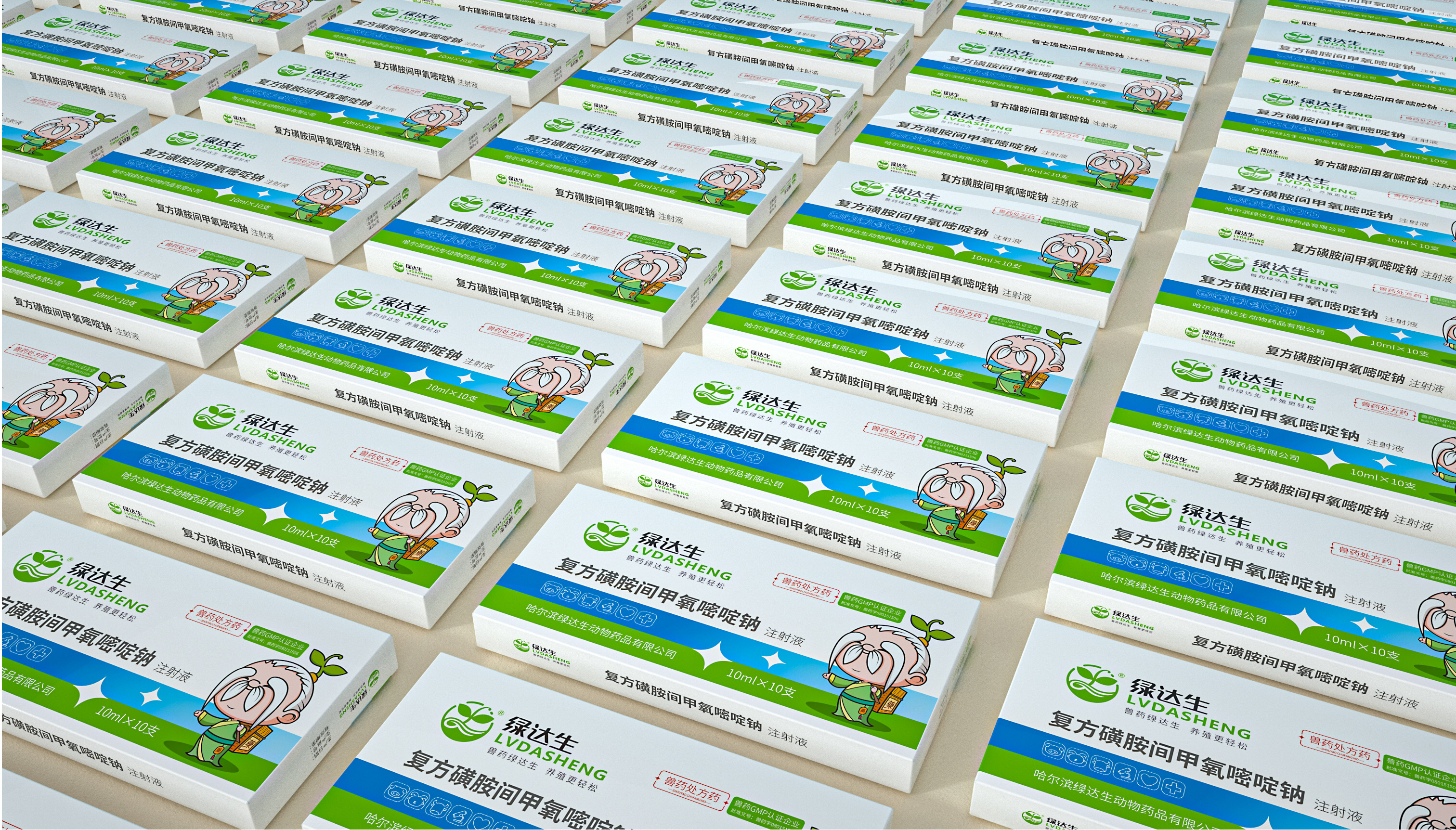 企業在市場廝殺多年,原有的標志已經在大批消費者心中積累了一定的認知資產,標志不能大刀闊斧的改動,而是在原有基礎上優化逐漸替代原有標志;同時需要明確的是企業的核心定位和競爭力,需要回答綠達生究竟是誰以及能夠解決的問題。繽策將企業核心品類的獸藥提出并強化,打造出企業專屬slogan——獸藥綠達生,養殖更輕松,一舉解決品牌認知和選擇難題;而在視覺傳播上,選擇時下流行的IP能夠幫助消費者快速辨別和認知品牌,同時也將于市場同類競品相互區別,進而脫穎而出,根據品牌獸藥的行業特性,將品牌IP設定為有草藥精靈幻化而成的道骨仙風的老中醫,形象獨特可愛,同時融入傳統中醫元素,打造讓國人更有共鳴的形象,并一以貫之的落實在包裝及延展上。