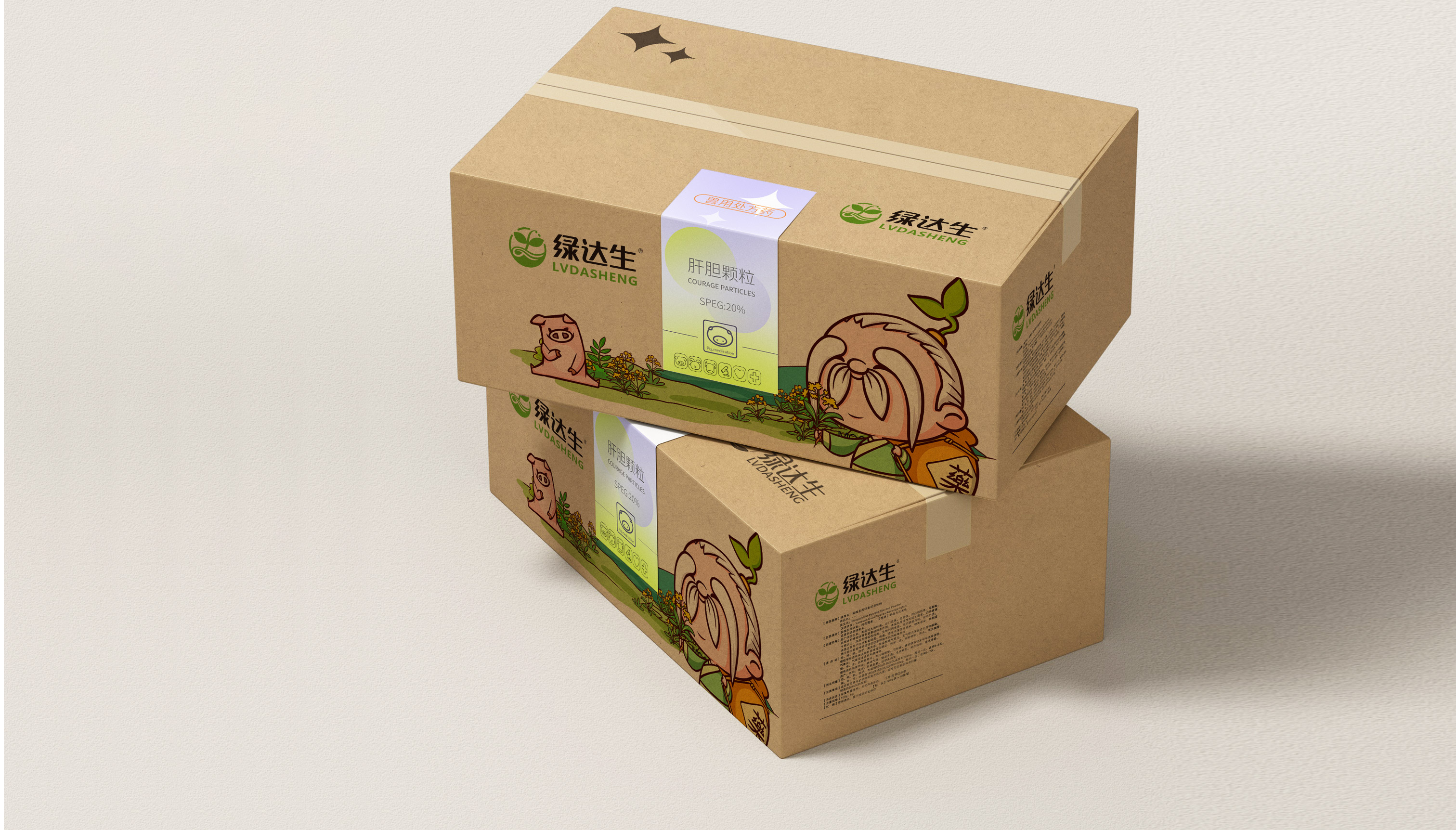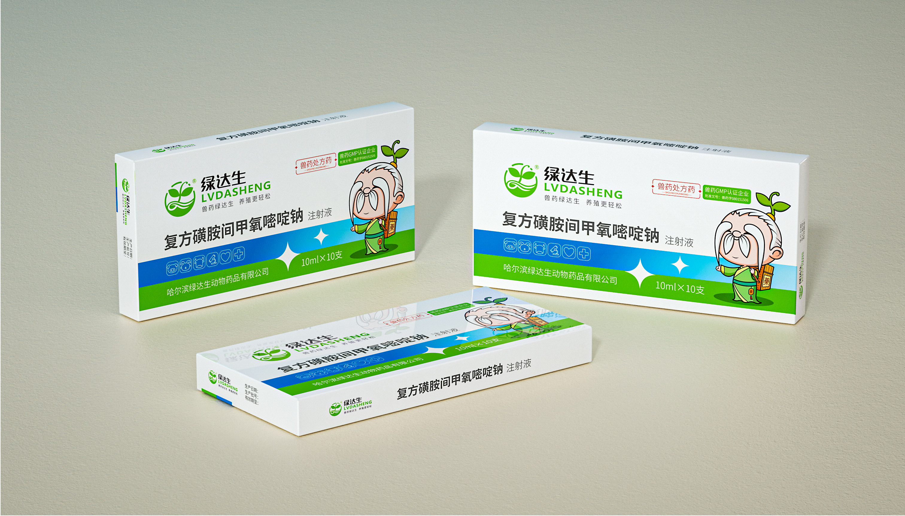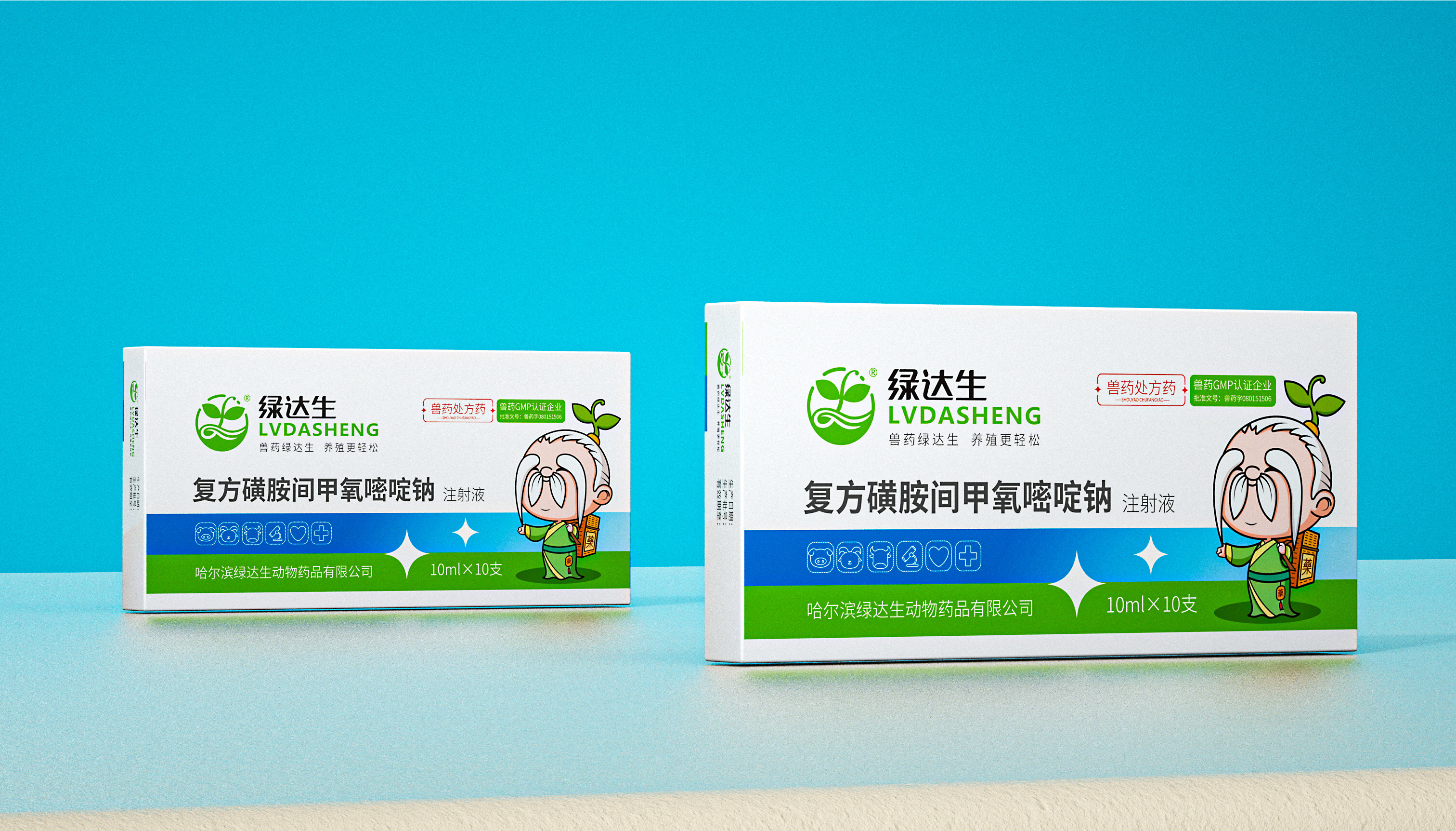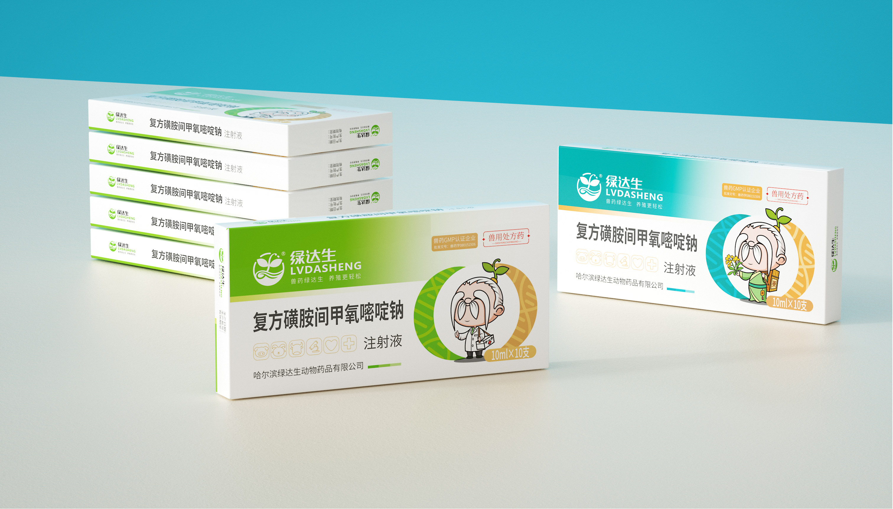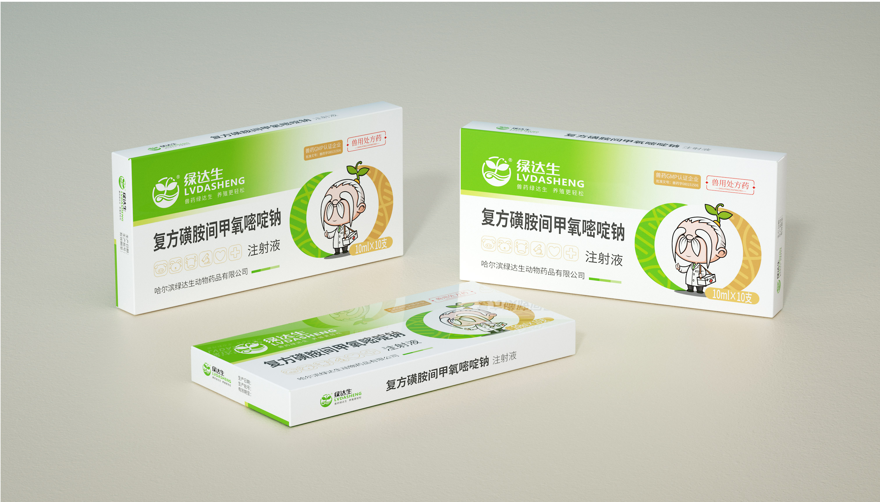 企業在市場廝殺多年,原有的標志已經在大批消費者心中積累了一定的認知資產,標志不能大刀闊斧的改動,而是在原有基礎上優化逐漸替代原有標志;同時需要明確的是企業的核心定位和競爭力,需要回答綠達生究竟是誰以及能夠解決的問題。繽策將企業核心品類的獸藥提出并強化,打造出企業專屬slogan——獸藥綠達生,養殖更輕松,一舉解決品牌認知和選擇難題;而在視覺傳播上,選擇時下流行的IP能夠幫助消費者快速辨別和認知品牌,同時也將于市場同類競品相互區別,進而脫穎而出,根據品牌獸藥的行業特性,將品牌IP設定為有草藥精靈幻化而成的道骨仙風的老中醫,形象獨特可愛,同時融入傳統中醫元素,打造讓國人更有共鳴的形象,并一以貫之的落實在包裝及延展上。