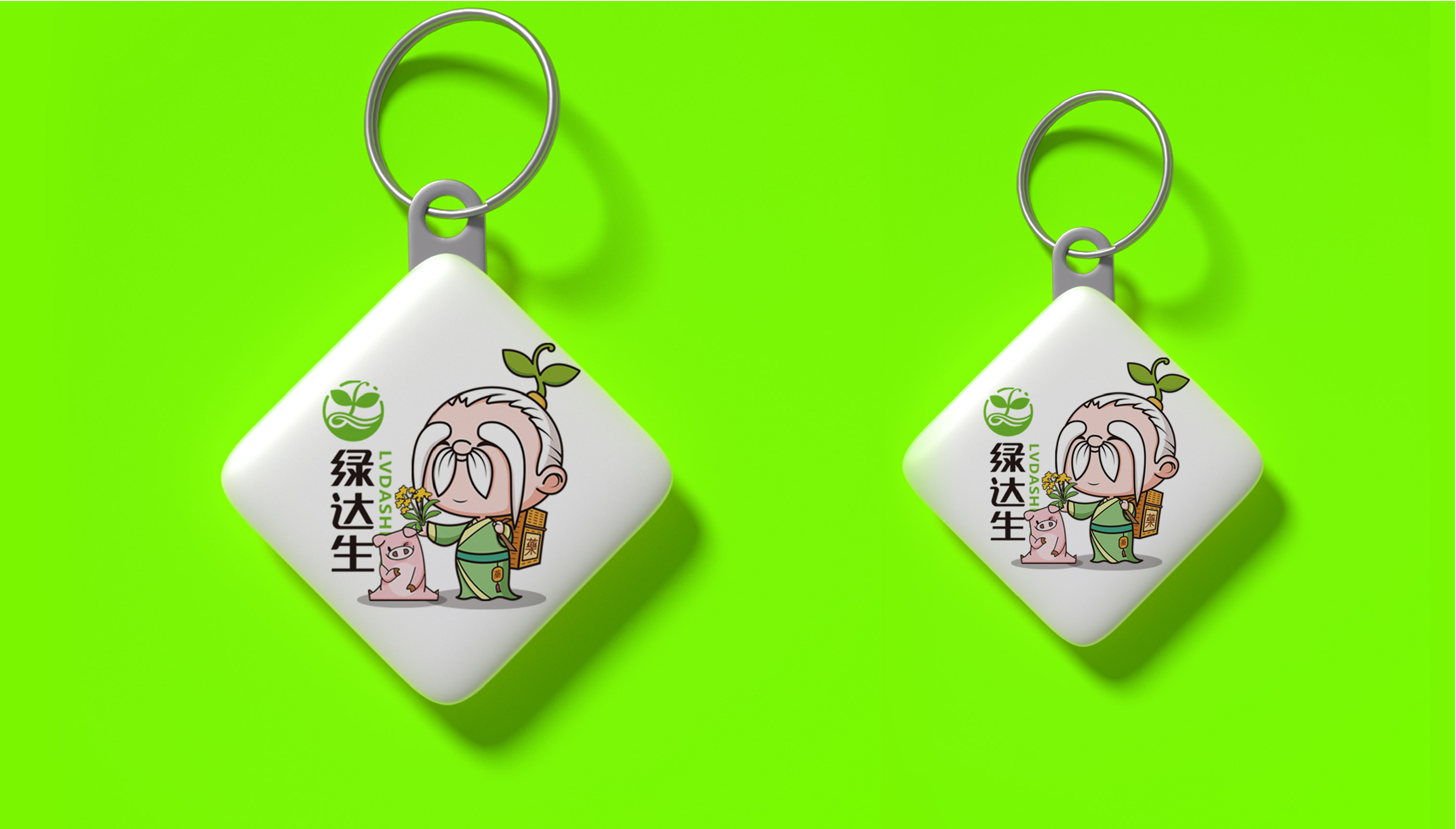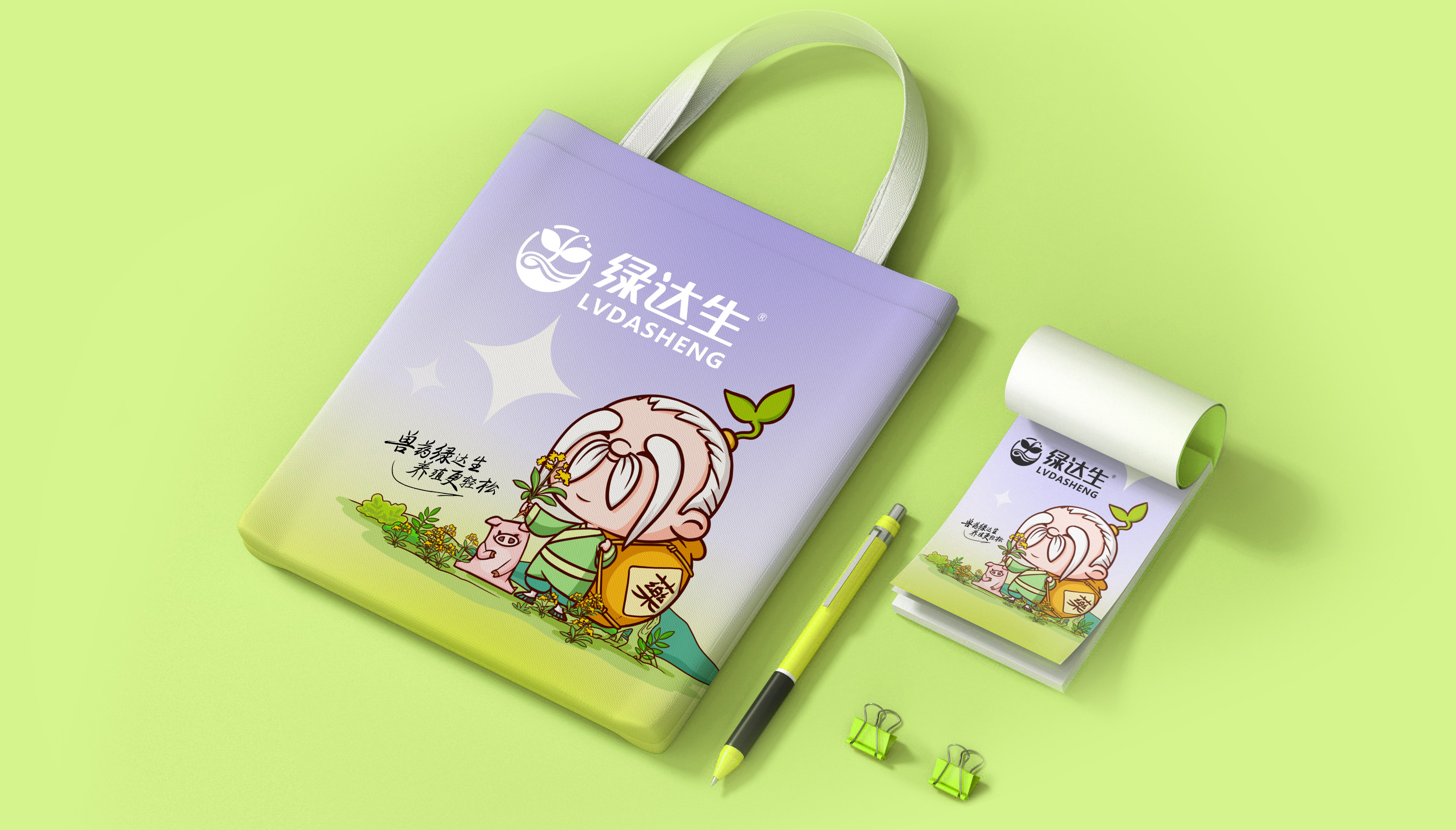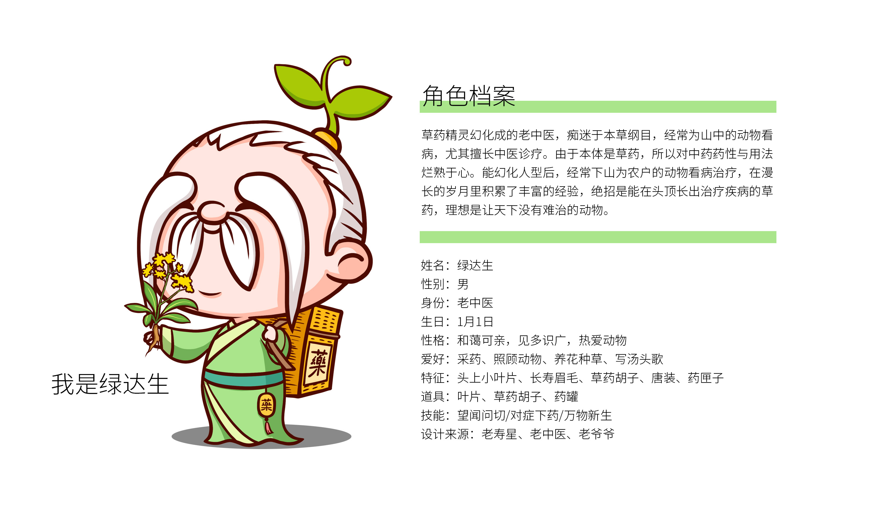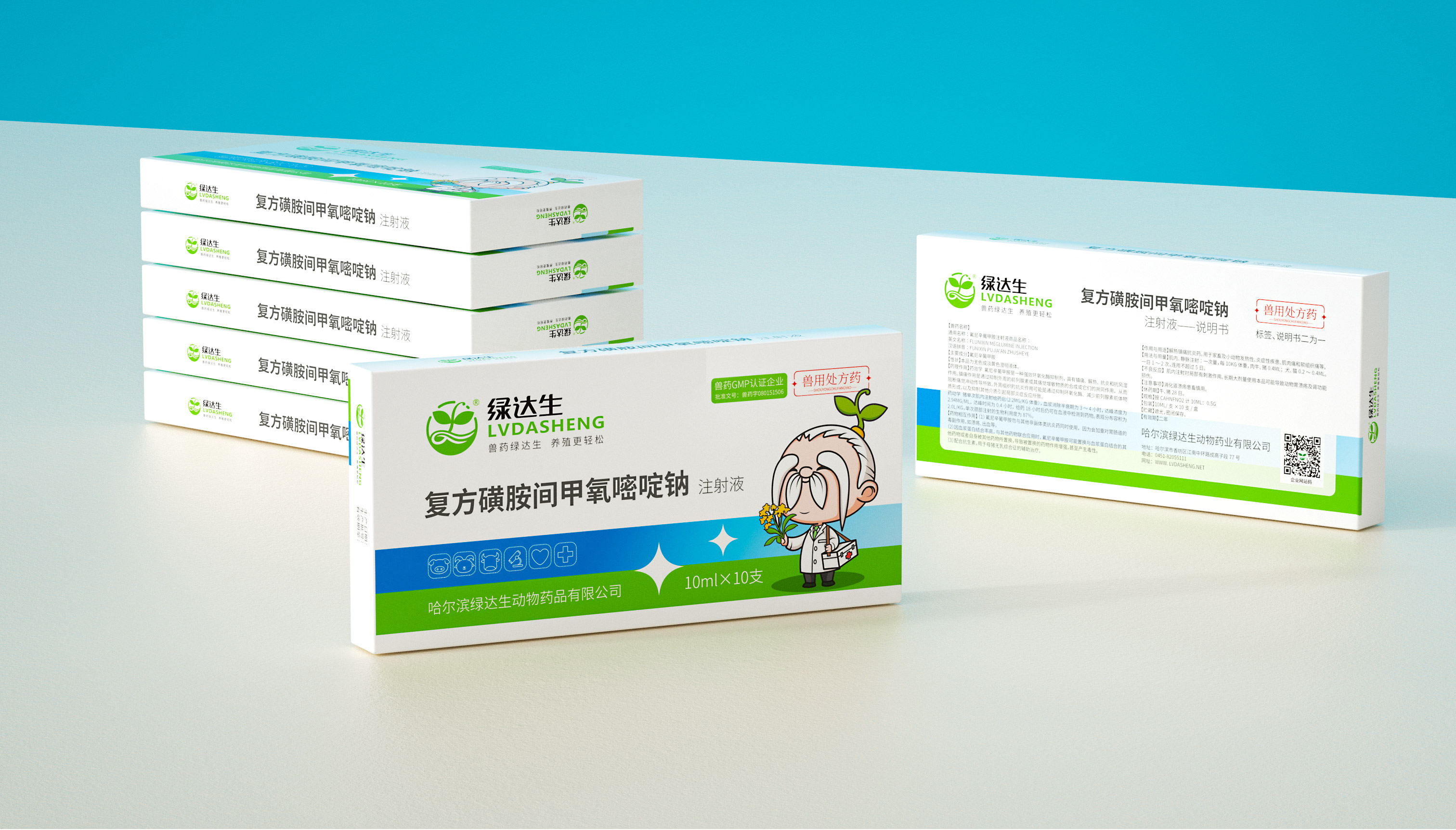企業在市場廝殺多年,原有的標志已經在大批消費者心中積累了一定的認知資產,標志不能大刀闊斧的改動,而是在原有基礎上優化逐漸替代原有標志;同時需要明確的是企業的核心定位和競爭力,需要回答綠達生究竟是誰以及能夠解決的問題。繽策將企業核心品類的獸藥提出并強化,打造出企業專屬slogan——獸藥綠達生,養殖更輕松,一舉解決品牌認知和選擇難題;而在視覺傳播上,選擇時下流行的IP能夠幫助消費者快速辨別和認知品牌,同時也將于市場同類競品相互區別,進而脫穎而出,根據品牌獸藥的行業特性,將品牌IP設定為有草藥精靈幻化而成的道骨仙風的老中醫,形象獨特可愛,同時融入傳統中醫元素,打造讓國人更有共鳴的形象,并一以貫之的落實在包裝及延展上。