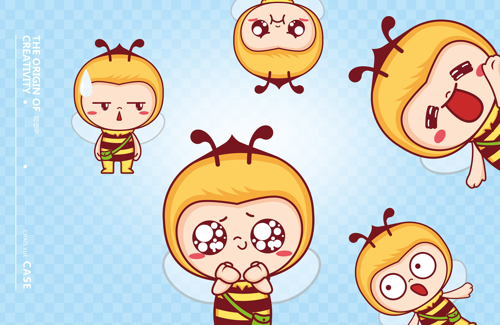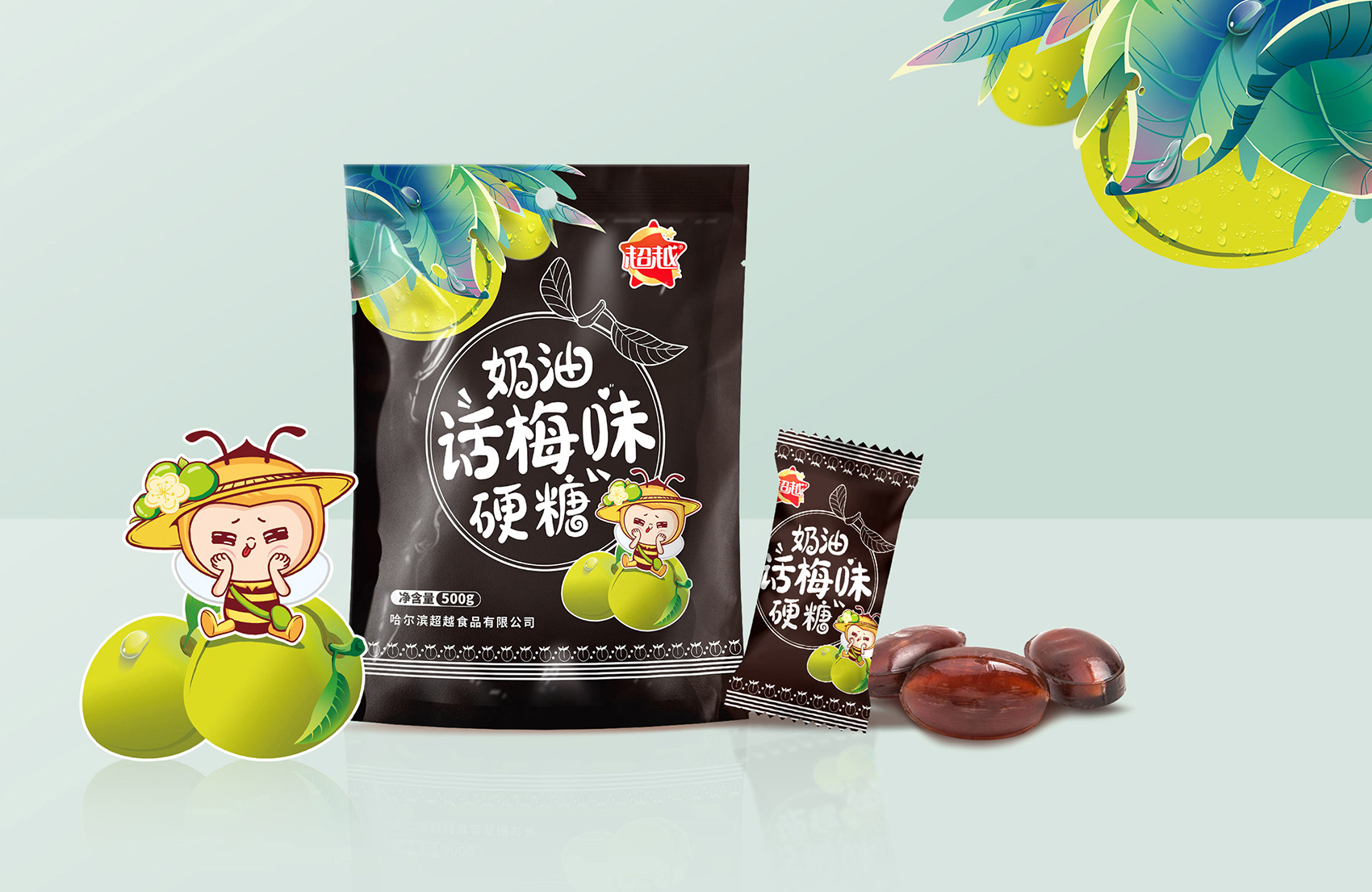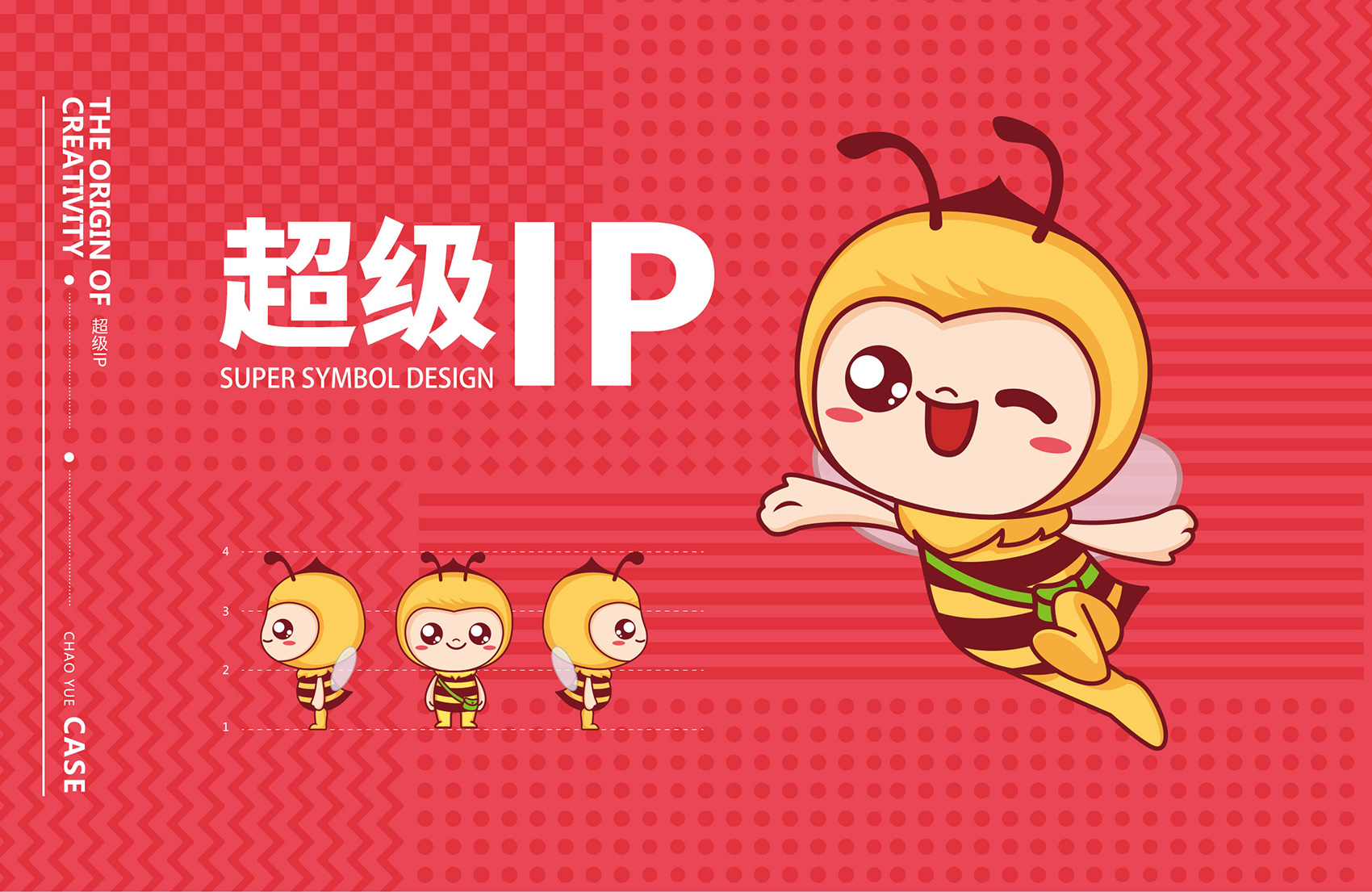 品牌主營的老式糖果在目標消費者新中式過去艱苦歲月的一絲絲幸福,而超越糖果的使命與最宗目的是為廣大消費者創造美味,體驗幸福,正如蜜蜂在消費者心中是勤勞、靈動的象征,一看到蜜蜂會下意識想到蜂蜜,進而聯想到糖果的甜蜜與芬芳。結合創始人至今人就在生產崗位上辛勤工作,這份堅守正是超越所代表的的深厚品牌文化的體現,所以繽策在眾多蘊藏著文化原力的富豪中選擇了蜜蜂的形象,加之一束花處理,讓形象更符合時下年輕人的審美,賦予了IP活潑可愛,軟萌逗趣的性格特征,有效的拉近與消費者之間的距離,具象化品牌文化與品牌精神,讓消費者能夠一眼辨認出品牌,便于記憶與傳播。