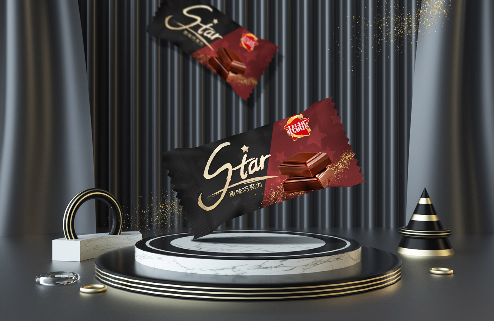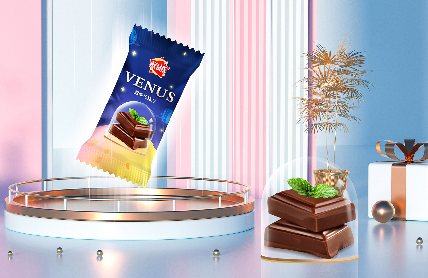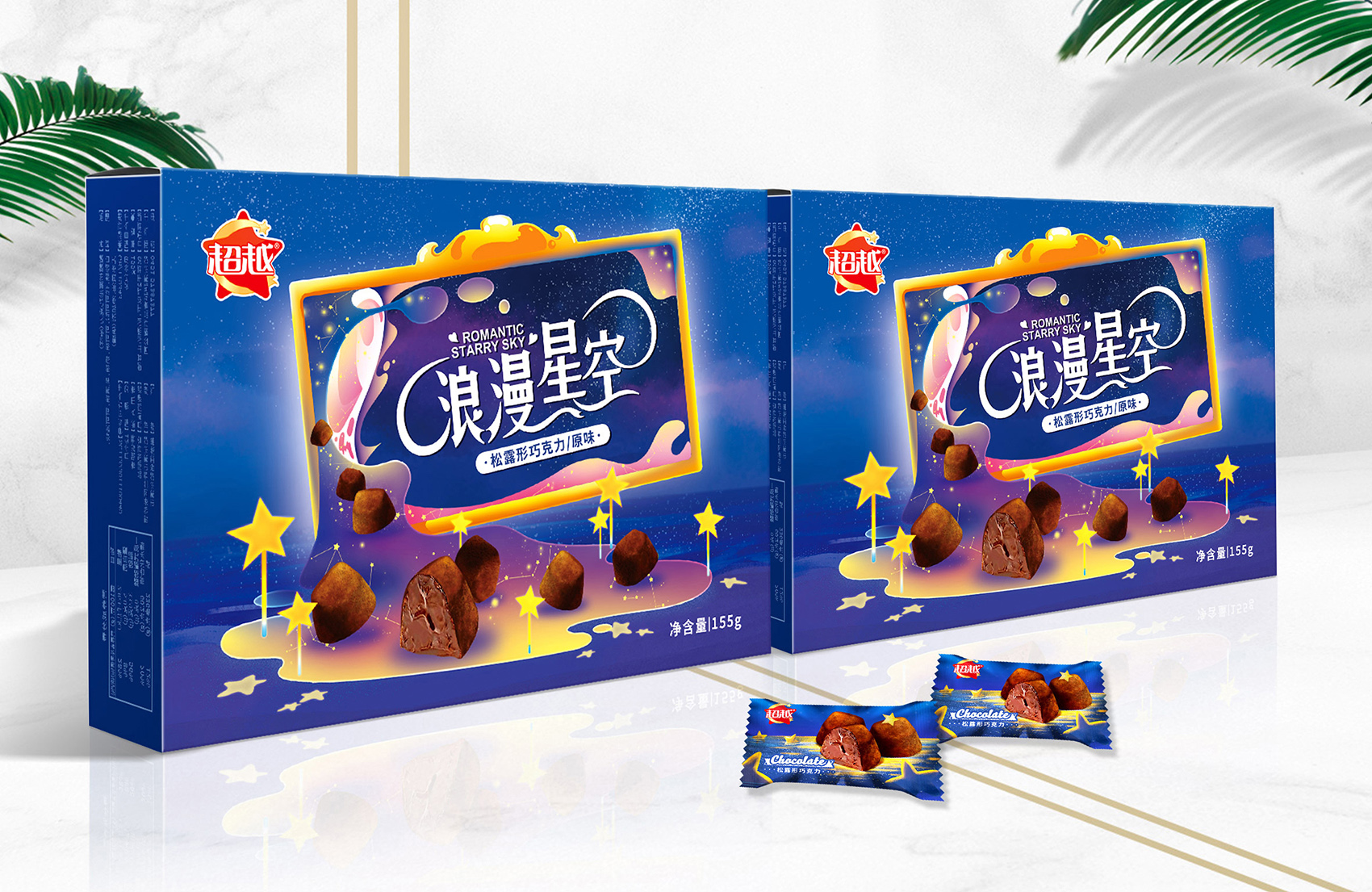 作為巧克力線中的禮盒款,本款產品需要展現出其價值感,繽策以品名浪漫星空進行構思,以相框框住浪漫的星空,傾灑而下的夢幻銀河系,星座隨之奔涌,將璀璨的星光帶入心田,恰如甜蜜順滑的巧克力浪漫入骨,星星型的仙女棒點綴其中,增添了活潑時尚的氣息,主色調選用天空與云霞的漸變色系與金黃的畫框對比鮮明和諧,層次感十足;原創設計字體加入象征浪漫甜蜜的絲帶與愛心 ,其中浪字與漫字的連接處也可視作兩個比心的手,更加突出包裝的曼妙迷人的氛圍,整體包裝柔和輕快,時尚爛漫,令人過目難忘。