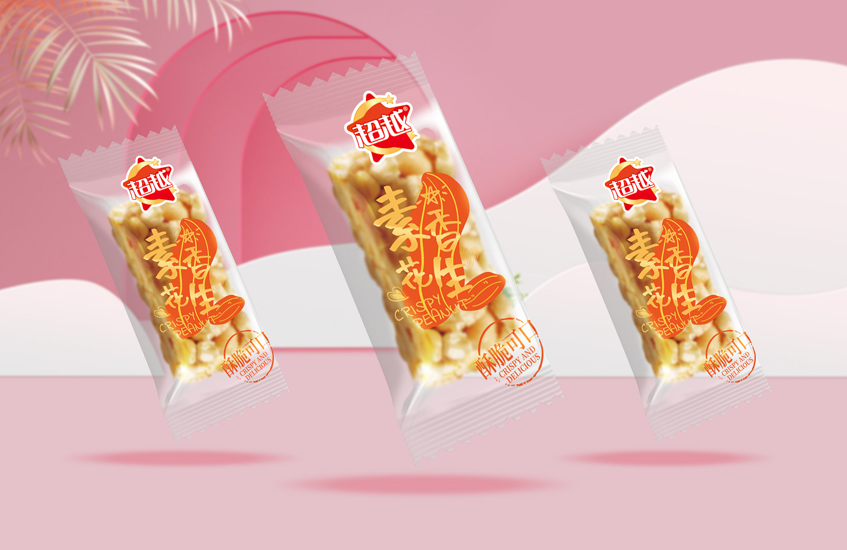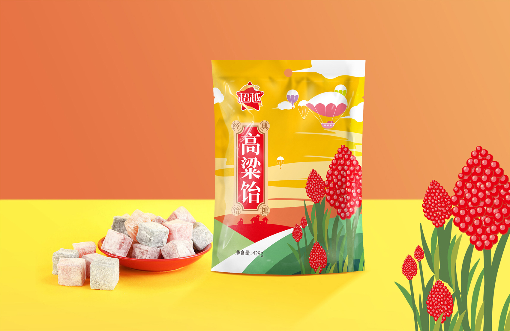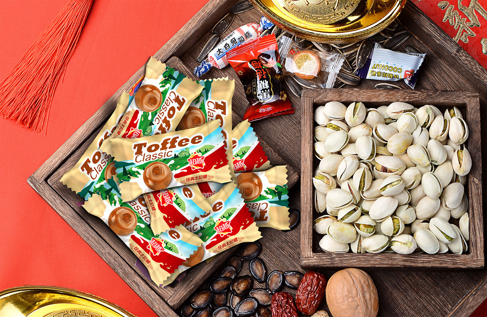 由于品牌品類中傳統中式糖果占比較高,同時品牌精神內核也貫徹了傳統勤勞勇敢的要素,所以在通用外包裝上,繽策決定選用融匯古今中外集大成者的國潮等個,配合時下流行的厚涂風格,加入松柏、桃花、祥云等傳統意象使得畫面具有濃郁的中華氣息,品牌IP則換上了京劇頭飾,這一代表這國粹的經典符號,讓消費者聯想到傳統文化;縱向排版形似春聯,與背景中雕花窗欞相互呼應,在內容與形式上達到高度的統一;配色上也遵循了傳統年畫中的大氣華美,絢爛奪目,便于記憶與傳播。
