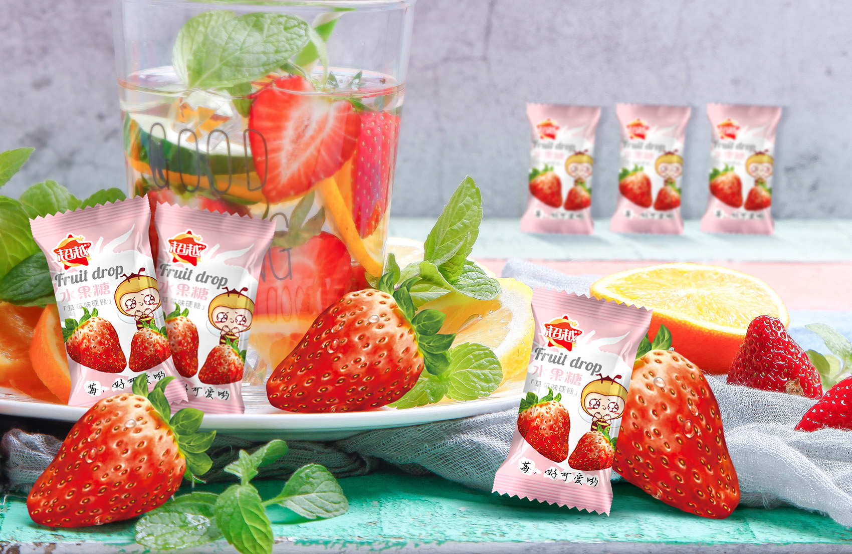 新式水果糖面向的目標消費人群為年輕群體,而刺激購買欲的最好手段就是真實攝影元素,利用逼真的視覺刺激引導消費者進一步聯想,為了更好的與其他常規的糖果包裝相區隔,畫面中的水果插畫采用了真實向的厚涂畫風,與常規使用完整的水果相比,切片的水果更能凸顯鮮嫩多汁,飽滿甜蜜的感覺,在視覺上引發消費者食欲,激發購買欲望。在色調上,使用與產品口味對應的水果本色,強調了水果糖的屬性,色調上活潑鮮艷,鮮明突出,惹人喜愛;整體包裝以超級符號為基礎,產品特點突出,時尚大方,符合現代消費者審美,整體兼具記憶點與美感,便于消費者記憶識別傳播。