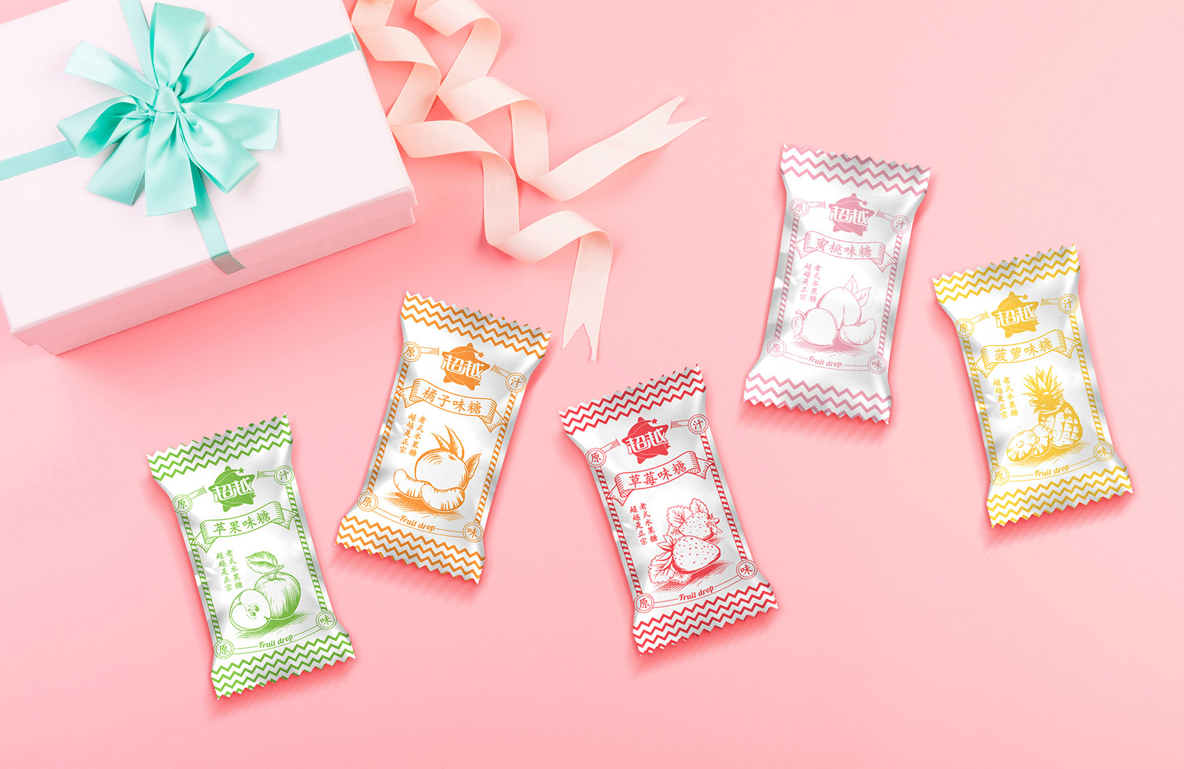 本系列產品為傳統口味的水果硬糖,經典的造型與質樸的滋味是對往昔歲月的紀念,目標消費人群為中老年群體,所以包裝運用經典版畫與品牌專屬輔助圖形構成畫面,老式銅版畫風格,爽朗利落,線條根根分明,帶有鮮明的年代感,針對產品目標客群激發出熟悉與親切感,并明確產品老式水果糖的產品屬性。專屬的輔助圖形讓品牌更具辨識度;版式方面,在致敬經典老式糖紙的基礎上,讓元素之間的聯系更為緊密,整體更為美觀;在色調上,利用對應的產品口味代表色調進行區隔,讓消費者能通過顏色辨別出口味,同時柔和飽滿的色調凸顯出復古懷舊的感覺,強化產品技藝的同時,在消費者心智中將超越與老式水果糖相連接,便于記憶傳播。