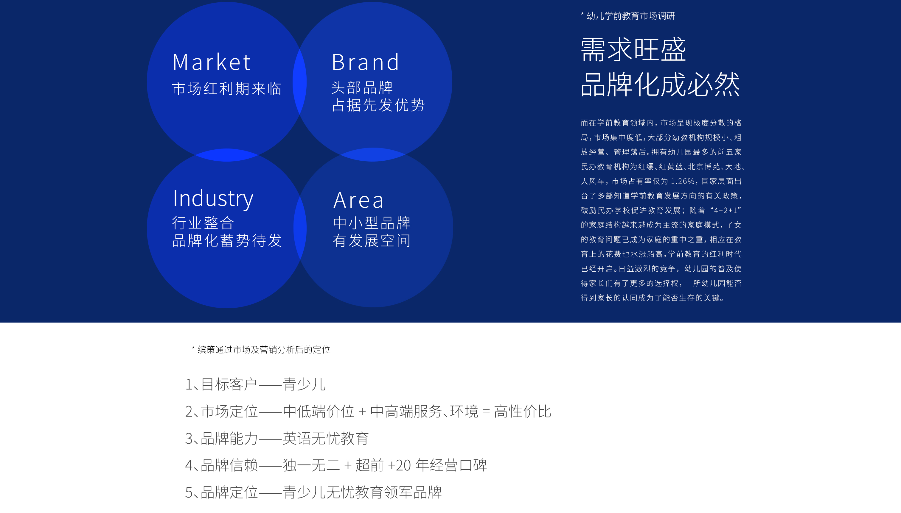 教育行業屬于剛需市場,貫穿著從學齡前至本科及以上,其重要性不言而喻,而其特殊性在于消費決策者與消費體驗者的錯位,即選擇教育品牌的往往是家長,而上課的則是孩子,所以教育品牌面對的是家長與孩子作為整體家庭的消費者,塑徳求實的產品線涇渭分明的同時,又有其關聯,在體驗完幼兒園產品線的消費者往往也同樣會繼續選擇英語產品線,所以在定位上既要概括這兩種不同的目標客群,同時也要明確企業的優勢項目——少兒教育,并在品牌文化中融入獨特性——塑徳求實對于孩子們的愛,經過二十余家競品市場調研以及多次座談,繽策以青少兒無憂教育為定位,將愛孩子一輩子的品牌核心構筑整體文化,以標志性費老師個人IP為超級符號,全面建設塑徳求實品牌。